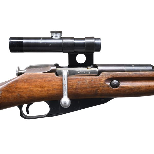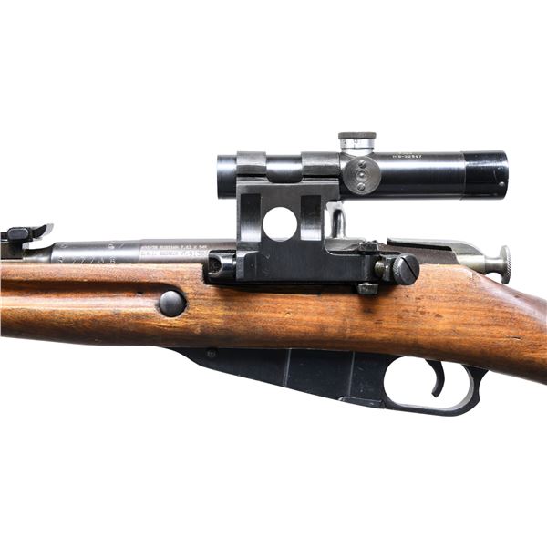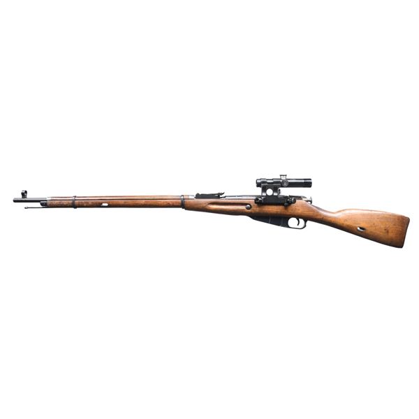 RIFLE WITH SNIPER SCOPE. Cal. 7.62x54R . S# 77706. Serial number appears on the left side of the bb. over the chamber. Original serial number "PC9201" appears on top over the chamber and on bolt, body, floor plate, and butt plate. Bbl. 28 3/4". Import-marked on the left side of the receiver. Rifle has original "PU" telescopic sight in a reproduction mount. The scope is marked on top with a "25" in a triangle, "M (5-pointed star) (hammer & sickle) (half moon) 91/30 NO5-22597." Screws in turrets have domed heads. Scope reticle has a pointed post and two horizontal bars. Tangent rear sight graduated to 2000 meters. Post front sight with protective hood. Bbl. is marked over the chamber with a hammer & sickle in a wreath and an arrow in a triangle. Dated 1944. Turned-down bolt handle has been added. Cleaning rod is present. Hardwood stock set with sling slots. Buttstock is marked on the right side with an encircled "IO," indicating Bulgaria, and has an indistinct circular marking due to arsenal rework finish. UNATTACHED ACCESSORIES: leather scope lens covers. CONDITION: stock set has moderate wear, staining, and handling marks, with its arsenal rework-type finish. Notable missing chip of wood below the scope mount on the left side. Metal retains a large degree of its arsenal rework blue finish, with thinning and light wear. Handguard tips have notably little finish. Scope and mount retain most of their blue finish. Optics appear clear and serviceable. Good, shiny bore with a hint of frosting in the grooves. (24-5997/RW). CURIO. $800-1,200.