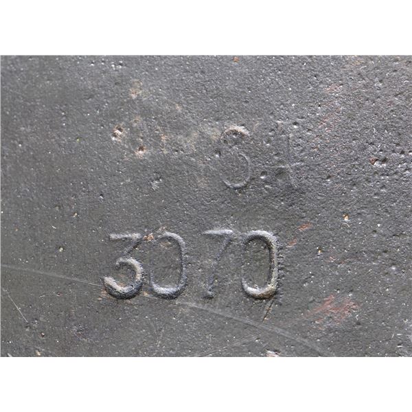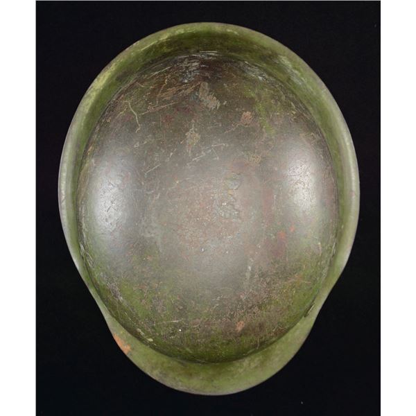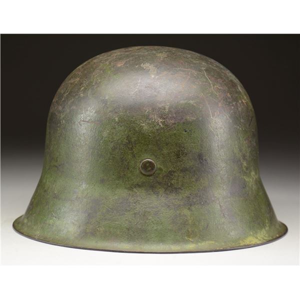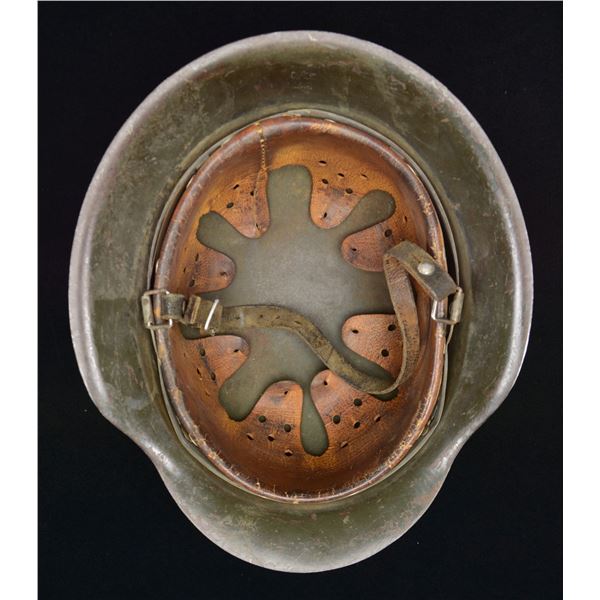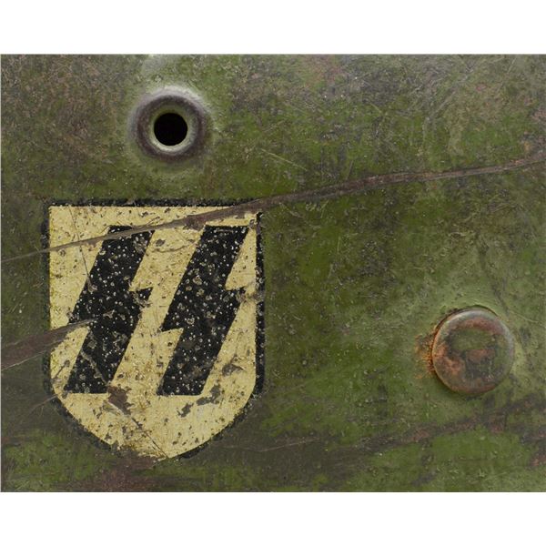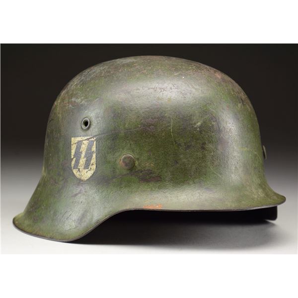 This exceptional helmet has a rich green-painted finish over what appears to be a darker green-painted finish, almost in camouflage style. The right side of the helmet has a single fine, original SS decal affixed at a slight angle. The interior rear of the helmet is stamped "__64" and "3070". Original, well-worn, light brown leather, 8-tongue liner with equally well-worn dark brown leather chinstrap. CONDITION: exterior painted finish is about 85%, but difficult to judge because of the blending of greens. The decal is also approx. 85%. The liner shows heavy wear with sweat stains but remains undamaged and complete. Chinstrap is also original and complete. (02-22799-3/BF). $4,000-6,000.