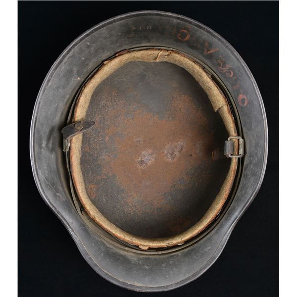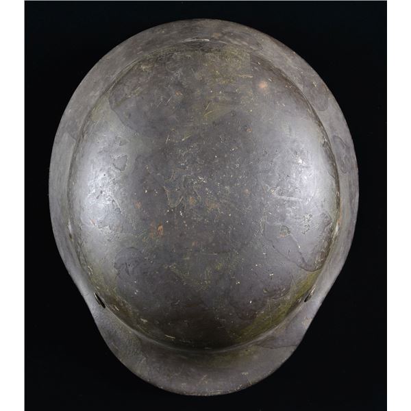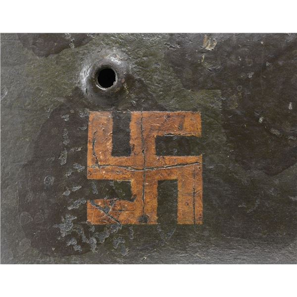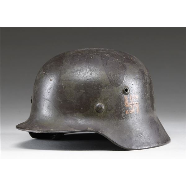 LIKELY FOR A FOREIGN FIGHTER. A fine example of a German M1940 helmet with dark green and dark brown camouflage paint of the period. The right side of the helmet is painted with a red and white quartered shield that is also, obviously, of the period. The left side of the helmet shows a white painted static party symbol. The interior rear of the helmet is stamped "9240" and the interior left is stamped "SE64". There are partially visible painted faded red letters on the rear brim that appear to read "O.Gefr. A_g___". There is no liner remaining and only a partial chinstrap. The band and felt covering remain intact. We were unable to identify the insignia on this helmet. We feel both the insignia and the camouflage paint are absolutely correct and of the period. A rare helmet perfect for the advanced collector. CONDITION: painted finish is about 90%. Only the ends of the chinstrap remain. Interior shows some oxidation, particularly at the crown. (02-23645/BF) $1,000-3,000.