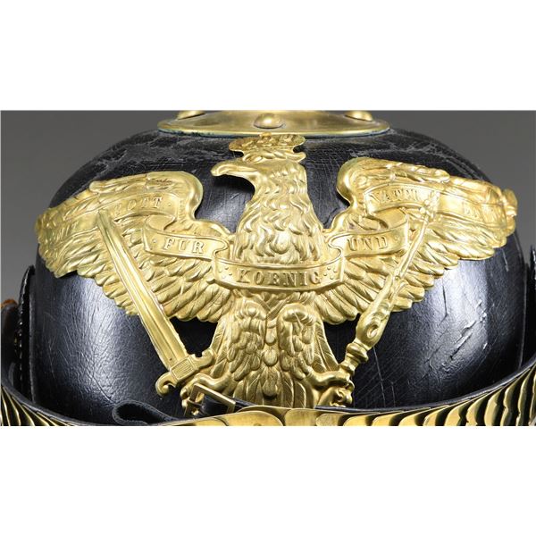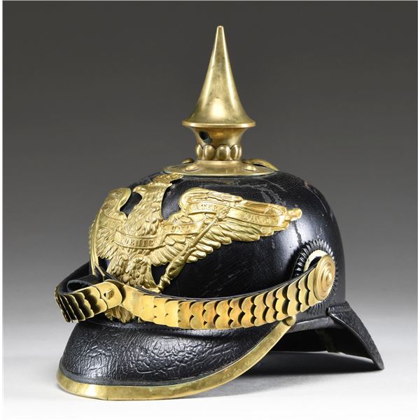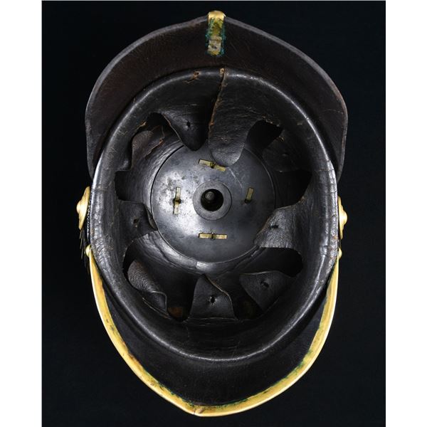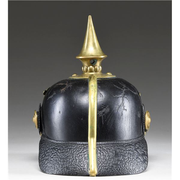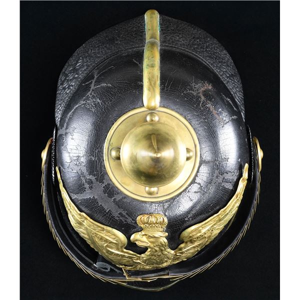 A good example of an Imperial German Garde NCO helmet from the Kingdom of Prussia. This NCO grade helmet has brass trim throughout. The trim includes a spike with round base, front plate, scaled chinstrap, side bosses, rear spine, and visor trim. There is a junior enlisted Prussian kokard on the left side and a similar National kokard on the right side. The interior of the visors is dark brown and the sweatband/liner is of the 9-tongue variety. CONDITION: there are a few areas of dyed finish loss on the body and the visors have notable alligatoring. The kokarden are not original to the helmet and the scaled chinstrap may be a replacement. Liner shows wear but is complete. (02-24028/BF). $800-1,200.