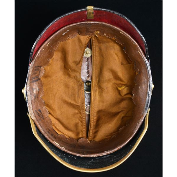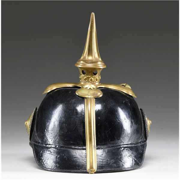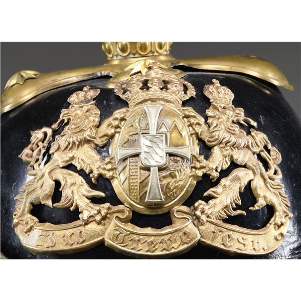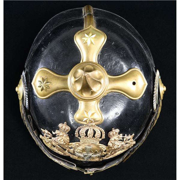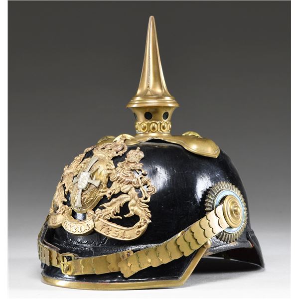 An attractive example of an Imperial German Reserve Officer's helmet from the Kingdom of Bavaria. This high grade officer helmet has gilded trim throughout, except for the silvered Bavarian Reserve Cross at the center of the frontplate. The trim includes a beautifully fluted spike with quatrefoil base, front plate, scaled chinstrap, side bosses, and visor trim. Oddly, there is an officer grade Prussian kokard on the right side and an NCO grade Bavarian kokard on the left side. The interior rear visor is red and the interior front visor is green. Wide leather scalloped sweatband stamped "K Z 10-32" with an illegible maker's label. The grosgrain liner has an interesting mustard color, possibly due to sweat stains. CONDITION: this helmet shows light overall wear with a solid body and lightly worn interior. One star from the quatrefoil base is detached, but present. A few chin scales are a bit loose but none are missing. There is expected light crazing to the body of the helmet. (02-24034/BF). $1,200-1,500.