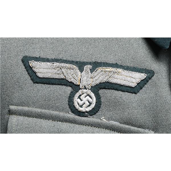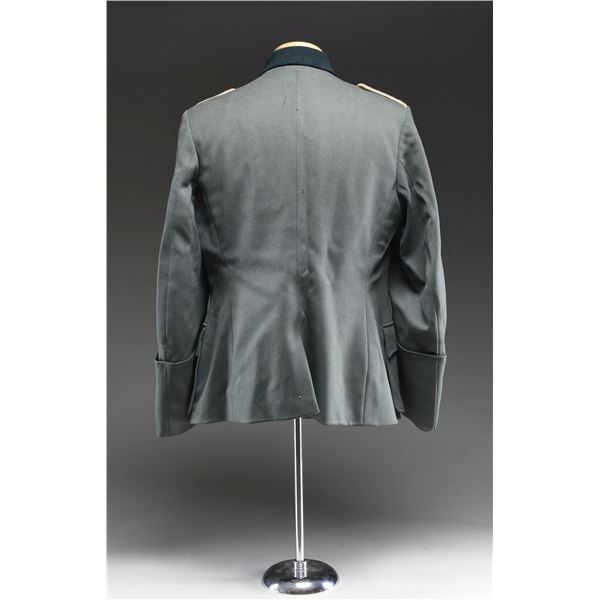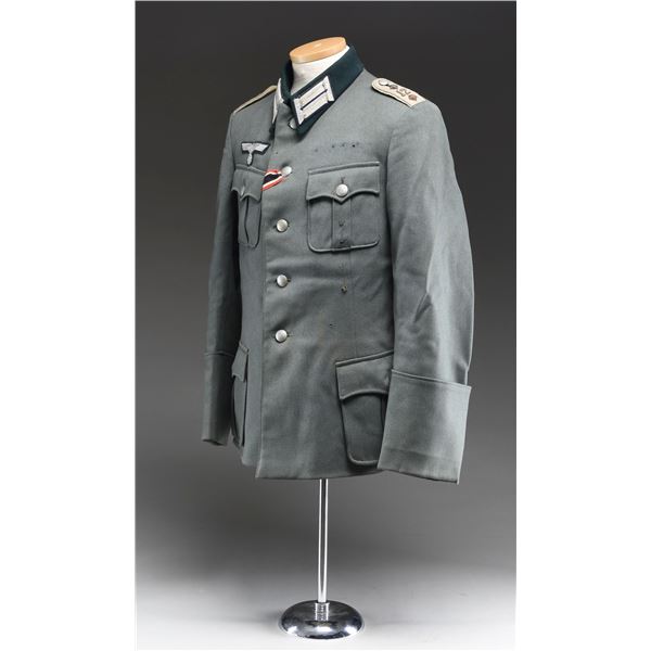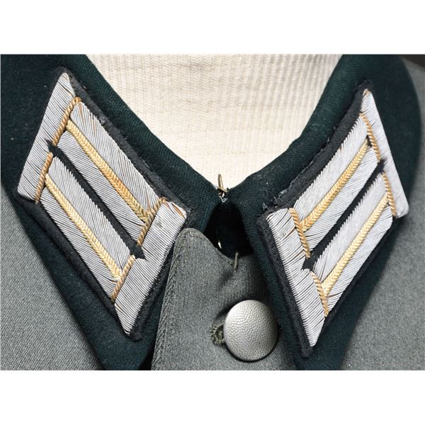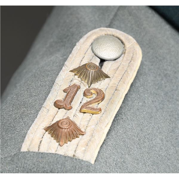 This tunic is made of a fine green wool body with a dark green collar. The collar features silver bullion collar tabs with a black background. The shoulders have straps showing 8 rows of bullion on a white field with 2 gold pips and the number "12". Above the right breast pocket is a fine silver bullion eagle and the second buttonhole has a 2nd Class Iron Cross ribbon attached. There are 4 loops above the left breast pocket and 2 loops on the pocket itself. There are 2 additional loops below the aforementioned pocket. The interior is lined with sage green rayon and the sleeves are lined in a cream colored rayon. There is an interior dagger\sword hanger with a clip marked "A DRGM". CONDITION: the tunic is in fine solid condition with all its original buttons. There are a few very minor scattered insect marks, generally on the reverse. (02-23665/BF). $900-1,200.