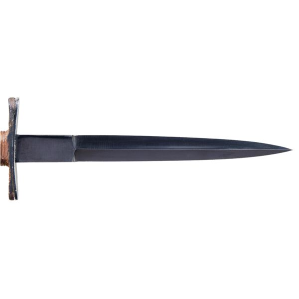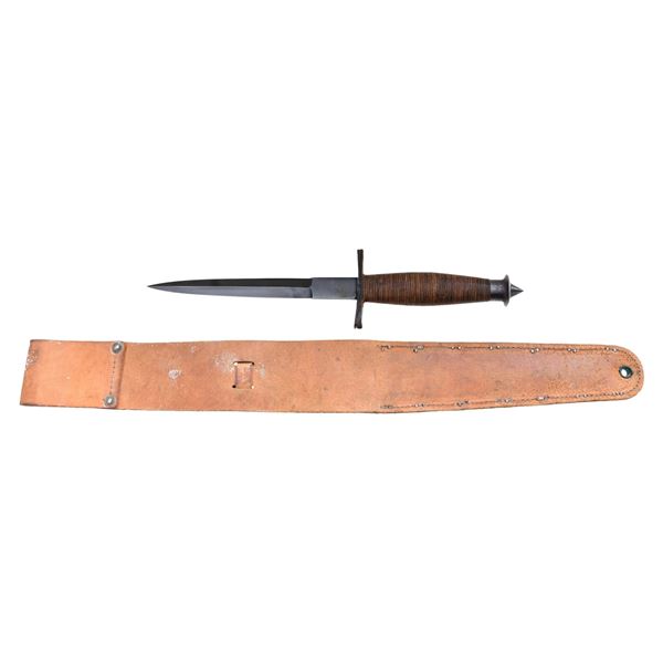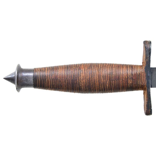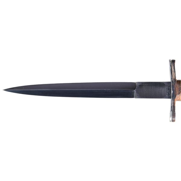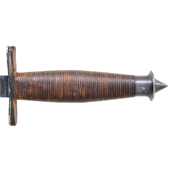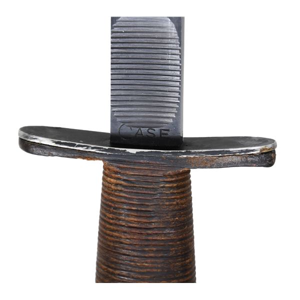 KNIFE. The 7 1/4" blued steel double edged blade is equipped with a thumb rest on the right ricasso which is marked "CASE". The right ricasso is unmarked. 12 1/2" overall including the pointed steel pommel. Leather washer grip with leather backed crossguard. Brown leather sheath 20" long has stitched and riveted construction. The throat is reinforced with 7 staples. Snap fastened retaining strap and brass lanyard hole at tip. UNATTACHED ACCESSORIES: padded zipper carrying case. CONDITION: the very lightly sharpened blade retains a high degree of its original blue finish. The balance of the metal shows light carrying wear with thinning and tiny spots of oxidation. Leather has light wear and staining. Sheath has light wear with moderate staining but fastenings remain tight. (02-23683/RW). NON GUN. $2,000-4,000.
