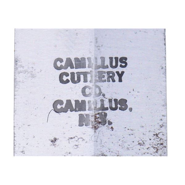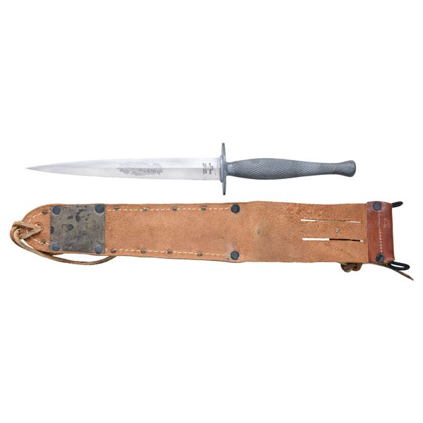 7 1/4" double edged bright blade. 12 1/4" overall. Manufactured exclusively by Camillus Cutlery Co. this attractive knife was reputed to be issued to Marine Raider units during WW2. The blade is etched on the left side with U.S.M.C. in a scroll and is also marked "CAMILLUS / CUTLERY / CO. / CAMILLUS / NY. The alloy grip has cast integral checkering and has a dull grey appearance. Brown leather scabbard is of the first type with 10 staples at the throat and metal plates riveted near the tip on both sides. UNATACHED ACCESSORIES Padded zippered case. CONDITION: blade has small areas of spotty discoloration. Grip shows little or no wear. Sheath has light wear, scuffing and verdigris around rivets. (02-23684/RW). NON GUN. $ 1,000-1,500.