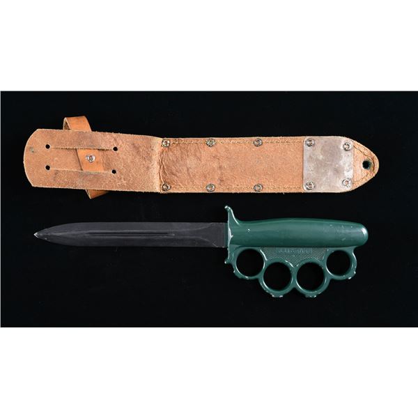 7" Double edge fullered blade with black finish. 12" overall. Dark green painted alloy handle with four finger loops. Loops have raised square points. Cast handle is marked "EVERITT" on both sides in raised letters within the checkered web. Tan leather sheath with snap closed retaining strap. Correct 6 staples at the throat. Brass lanyard hole at tip. CONDITION: knife retains 75% of its original black and green finish with light wear and flaking. Blade tip has been lightly sharpened. Sheath has very light wear and staining with some verdigris around snap and lanyard hole. Stitching is tight. (02-23686/RW). NON GUN. $1,000-1,500.