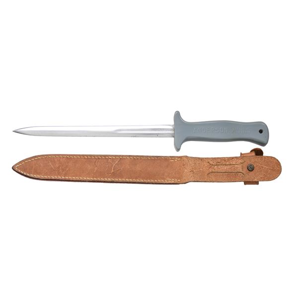 8 3/8" double edged fullered bright blade. 13 3/8" overall. These knives were made from salvaged blades of the 1913 Patton cavalry sword with the grey plastic handle cast in place. The handle has raised letters with those on the left side being "ANDERSON GLENDALE/ CALIFORNIA. the right side has "MADE IN USA". Brown leather sheath with "snap" retaining strap is unmarked. CONDITION: blade has light wear and small spots of staining. Handle has light wear and scattered small scratches. Sheath has moderate wear and staining but stitching remains tight. (02-23680/RW). NON GUN. $ 800-1,200.