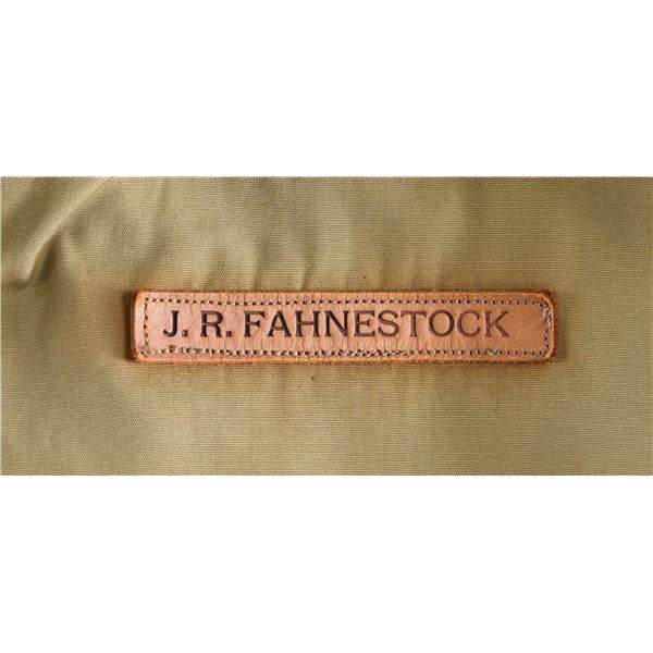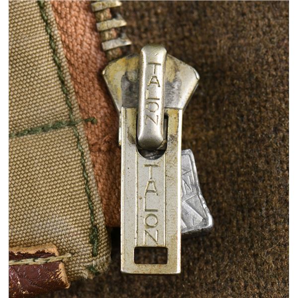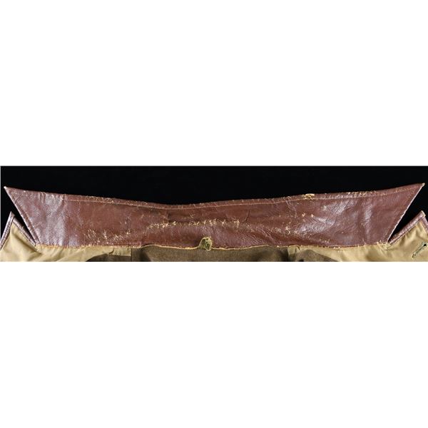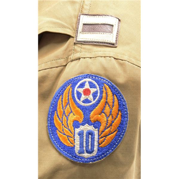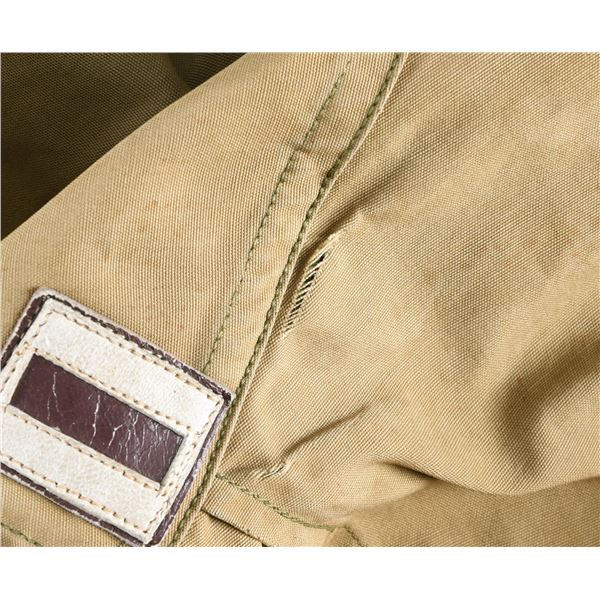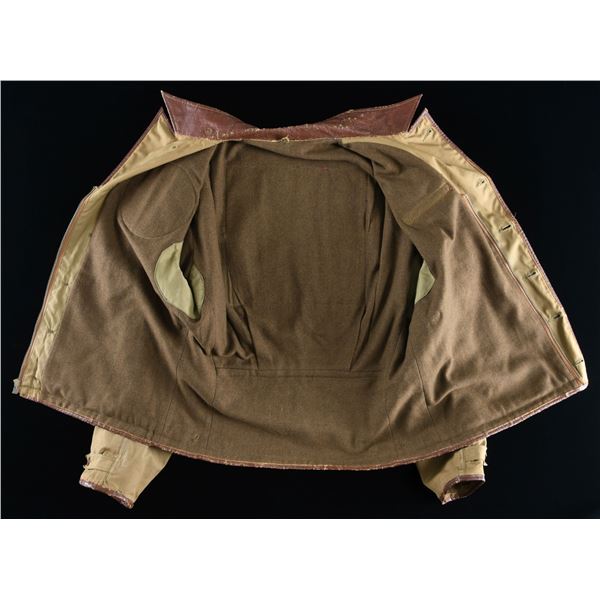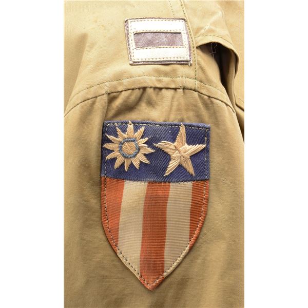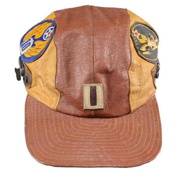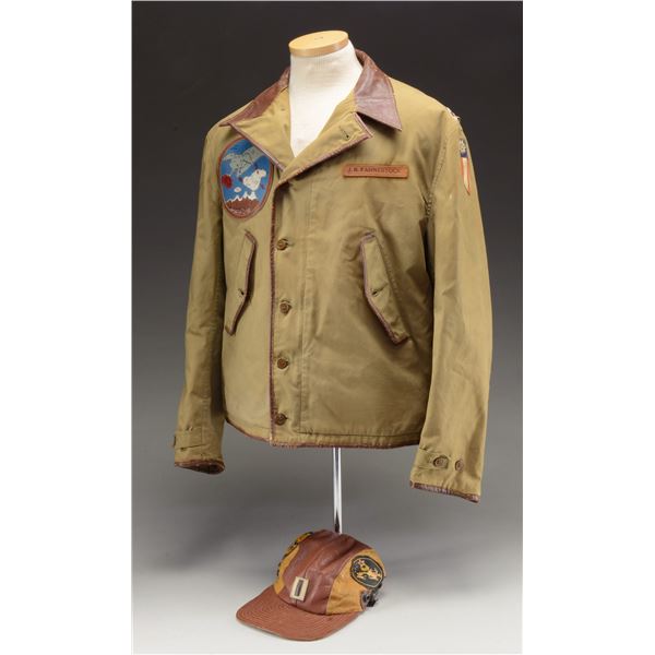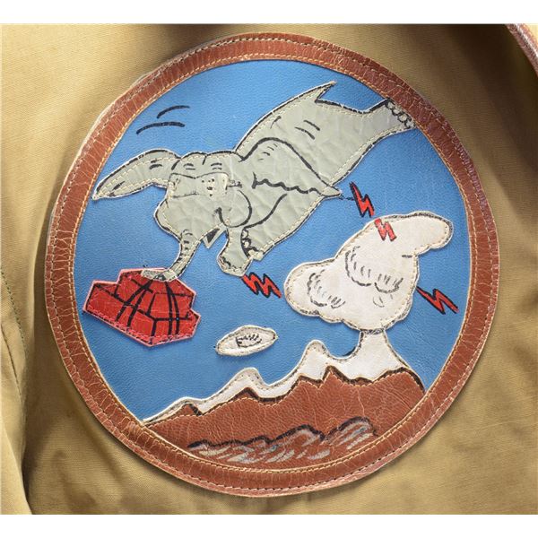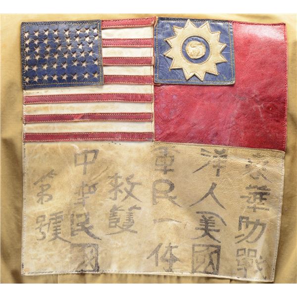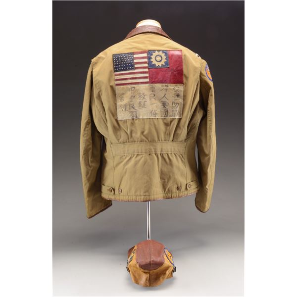 TIGERS FLIGHT JACKET & CAP. A truly superb early WWII greenish khaki cotton poplin flight jacket with a brown leather collar. There is brown leather trim down the front, across the bottom, around the cuffs, and on the edge of the flaps for the two diagonal slash pockets on the front. Inside the right pocket is a cloth tag that reads "Phila. Quartermaster Depot Inspected by". The zipper on the front is marked "TALON" and all buttons are brown plastic. The interior lining is fine OD wool, and there is a torn hanging loop at the collar. The right breast bears a large 5 1/2" diameter leather patch depicting a flying elephant carrying red cargo over mountains. This is possibly for the 11th Cargo Carrying Squadron of the 3rd Cargo Carrying Group of the 10th Air Force. The left breast has an impressed leather 4" nametag that reads "J.R. FAHNESTOCK". The left sleeve has a printed and embroidered CBI patch, and the right sleeve has a 10th Air Force patch. At the top of each shoulder is a brown and white leather set of Captain's bars. The rear of the jacket has a fantastic leather blood chit depicting the American flag and Chinese National flag above a white panel with several Chinese characters. The leather baseball-style flight hat is constructed of tan and brown leather, and features a 10th Air Force patch on the right side and an embroidered Flying Tigers patch on the left side. The front has a brown and white leather Captain's bar that matches the bars on the jacket. The hat has two snaps on either side with a clip on either side that has two rivets marked "RAU FASTENER CO." A unique opportunity to acquire a flight jacket that is worthy of being a centerpiece in even the most advanced WWII aviation collection. CONDITION: the jacket is exceptionally solid with some wear and minor scuffing to the leather. All patches are solid and original to the jacket, as is the blood chit and rank insignia. Likewise, all insignia and patches are original to the hat. (02-22921-2/BF). $2,000-3,000.