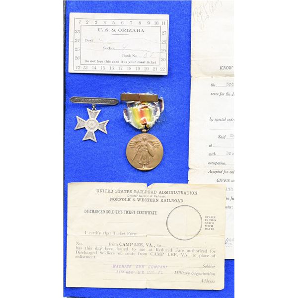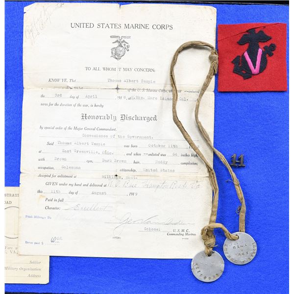 , AND MORE. This Marine group belonged to Private Thomas Albert Temple who enlisted at Billings, Montana. The group includes 1 5th Marine Brigade patch with a pink embroidered "V" on a wool felt EGA, all on a red field. / 1 pair of WWI dog tags that read "THOMAS A. TEMPLE APR. 3 1918 U.S.M.C." & "4615563". The tags are tied together with a khaki cotton cord. / 1 WWI Victory medal with worn ribbon. / 1 sharp shooter qualification badge. / 1 subdued "11" pin. / 1 "U.S.S. ORIZABA" 30 meal pass. / 1 Norfolk & Western Railroad discharge soldier's transportation certificate. / 1 honorable discharge from the Marine Corps. These items have all been together since the war and were obtained by the consignor from the family. CONDITION: all items show expected wear. Medal ribbon is tattered. Patch has a cut near the top that has been stabilized with tape. (02-24273/BF). $800-1,200.