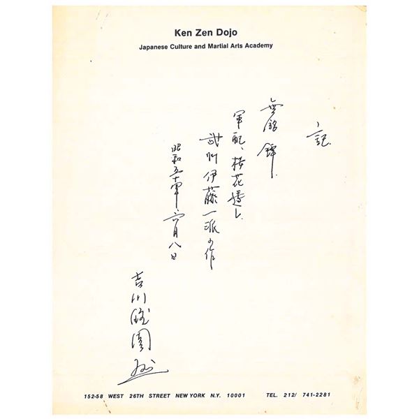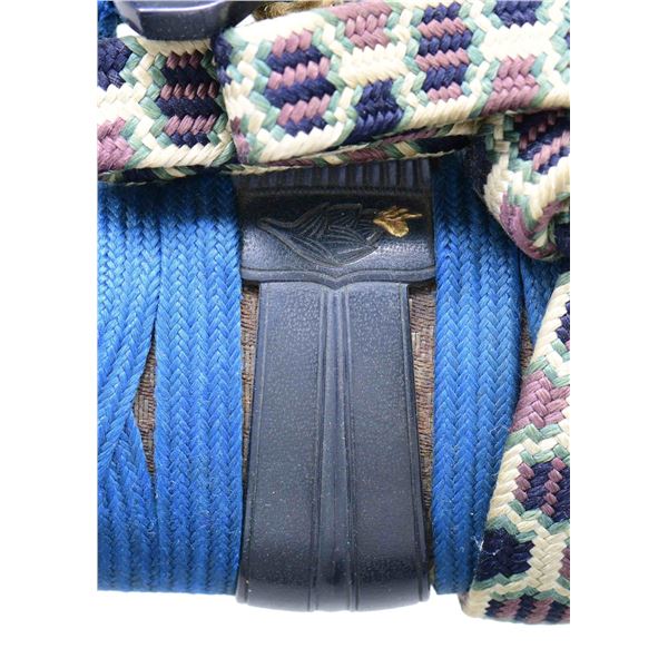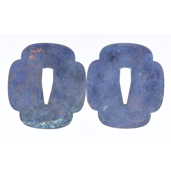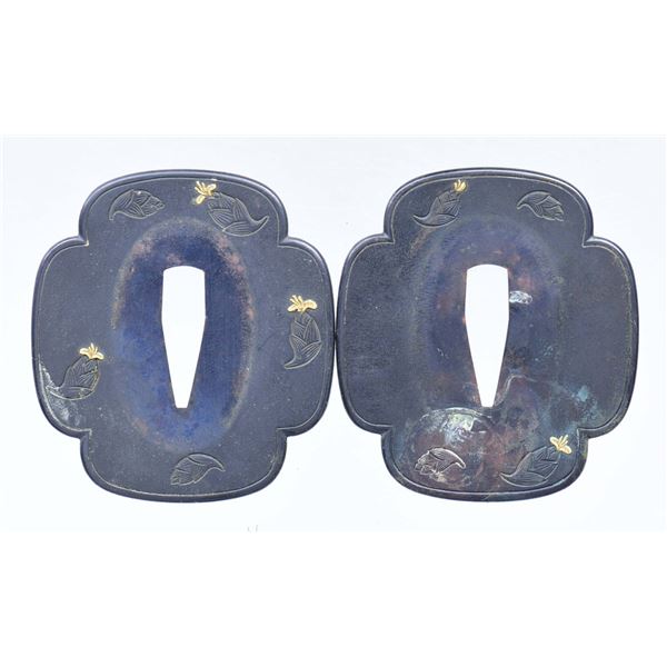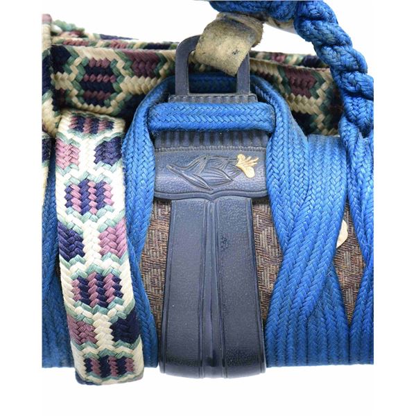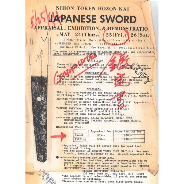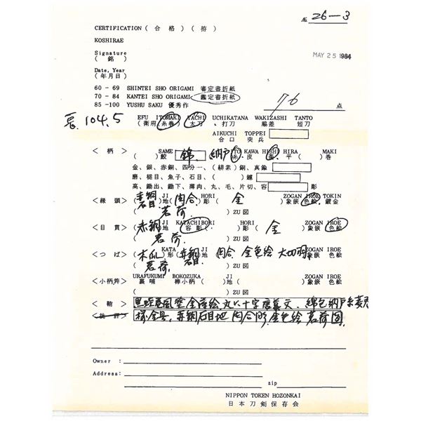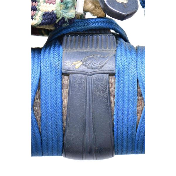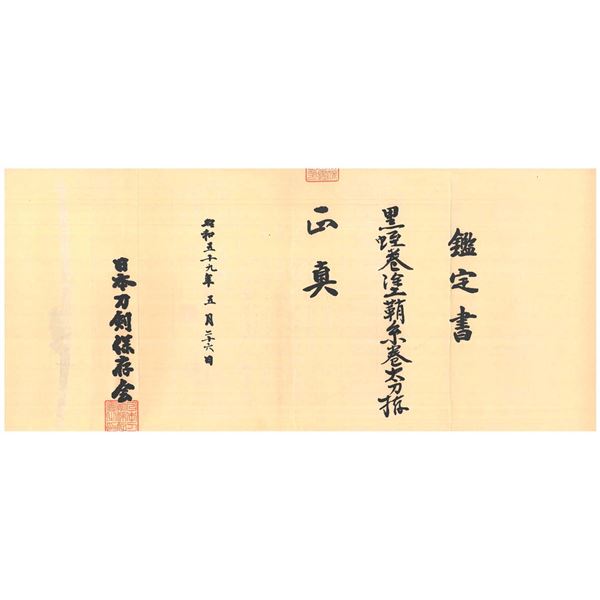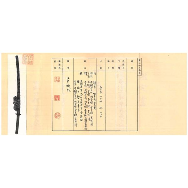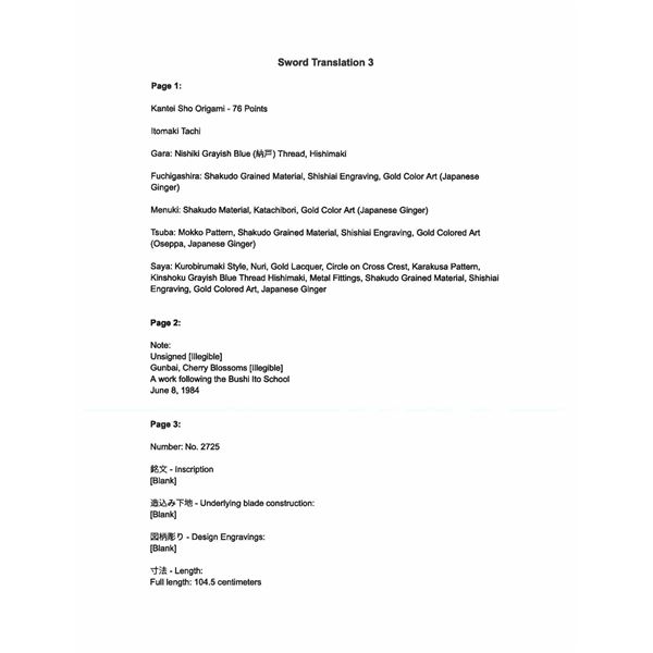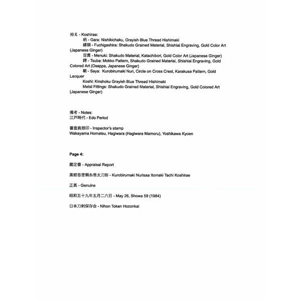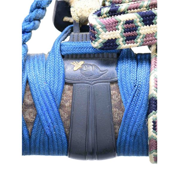 Please note as of 4/30/25 this item description has been updated. Please revisit this description and contact us with any questions. This katana measures 41” overall with a 27 7/8” hardwood blade. An exceptionally finely made example of a bokuto used in training for kenjutsu. These wooden blade katana are first seen during the Muromachi period, and versions of this historic weapon are still used today in martial arts training. This example is exceptionally ornate, featuring an expertly shaped blade with Japanese characters in black ink on both sides. Translation on the blade: The writing on the wood blade, which is called a tsunagi-gaki, attributes the blade that was in these mounts to Dewa Daijo Kunimichi. The longer side reads Dewa Daijo Kunimichi To (katana). The other side is the person who made the attribution--Hon'ami Kozon. Sadly, the blade is broken just above the integral wooden simulated habaki. The break is such that it could likely be repaired by a qualified craftsman. There is a two-piece patinated brass tsuba with gold floral inlays at the tips of chiseled buds. Matching gold-inlaid fuchi and kabuto-gane, along with perfectly matching menuki. Attractive cerulean tsuka-ito over finely patterned brown and tan silk. The saya is a true work of art, with matching gold inlays on all of the mounts, including the ashi. The top of the saya is wrapped with matching cerulean ito together with a black, brown, green, and tan, long, elaborate ito partially covered in fine black-printed white leather forming an elaborate sageo. The saya body is black and gold enamel featuring foliate motifs and crosses within circles. An exceptionally elaborate and visually stunning bokuto katana of absolutely superior craftsmanship. CONDITION: other than the fact the blade is broken above the habaki, the katana shows only the slightest wear throughout. (02-23632/BF). $1,000-2,000.