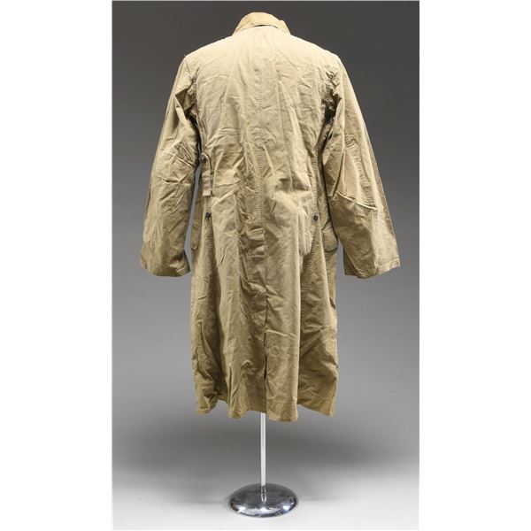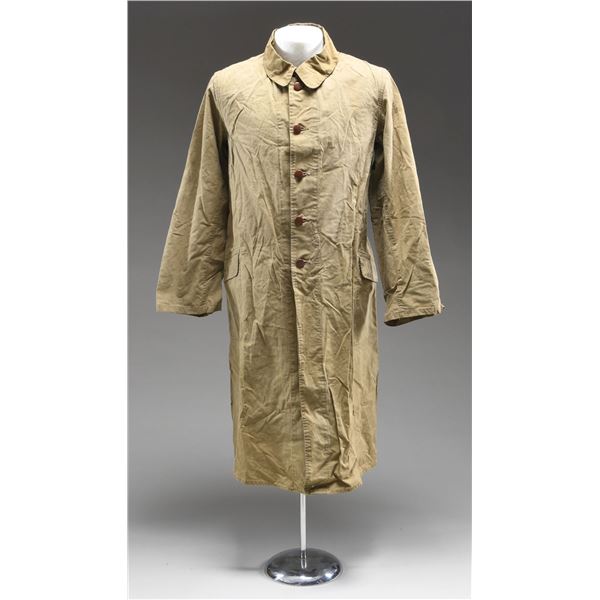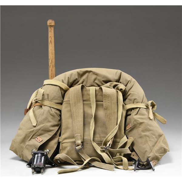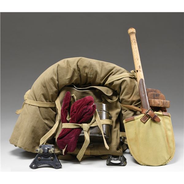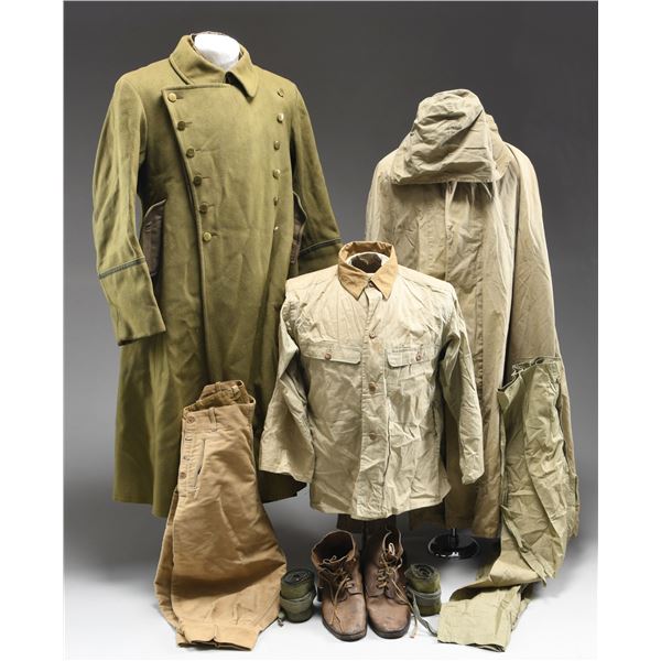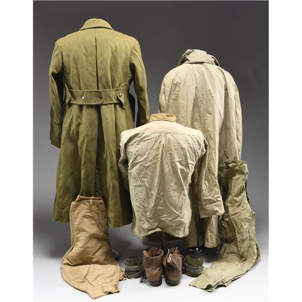 MATERIAL. This large and varied lot of WWII Japanese military items includes 1 pair of khaki brushed cotton mounted uniform pants. / 1 backpack with attached shelter section. / 1 mess kit. / 1 pair of wooden sandals. / 1 pair of slipper-socks. / 1 entrenching shovel with canvas and leather carrier. / 1 pair of brown leather short boots. / 1 pair of field green puttees. / 1 pair of coveralls with plain round composite buttons. / 1 pair of summer-weight fatigue pants with a tie string waist. / 1 summer-weight fatigue shirt with plain wooden buttons and internal Japanese ink stamps. / 1 long uniform coat with coconut buttons and red cloth collar insignia featuring two yellow stars. The uniform has several internal Japanese ink stamps. / 1 heavy officer's wool overcoat with plain brass buttons and two sewed in Japanese interior labels. / 1 apparatus that appears to be an electrical junction terminal. / 1 type 96 or 99 IMG bipod bracket. CONDITION: all items generally show light wear. Boots and sandals show moderate wear. (02-24298/BF). $1,200-1,800.