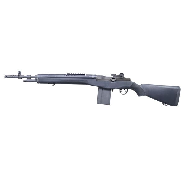 Cal. 308 WIN. S# 423312. Bbl. 21" including proprietary muzzle brake. Rifle is in a "scout" configuration and has a muzzle brake extending 3" beyond front sight. Standard aperture rear sight and blade front sight w/ protective ears. Rifle is equipped with a Picatinny rail forward of the receiver for mounting a scout type scope. This handy rifle has a black synthetic stock and a solid black butt pad. MAGS: 4-20 rd. 1-5rd. all marked "Springfield". UNATTACHED ACCESSORIES: Original factory owners manual and paperwork. "LULA" mag. loader. Black nylon "Springfield" padded case. Factory trigger lock. CONDITION: all aspects near excellent except bore which shows light wear and frosting. (25-806/RW). MODERN. $ 1,000- 1,500.