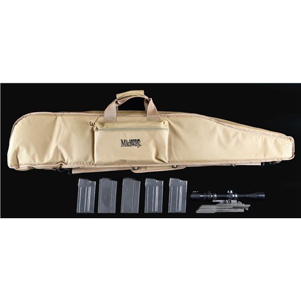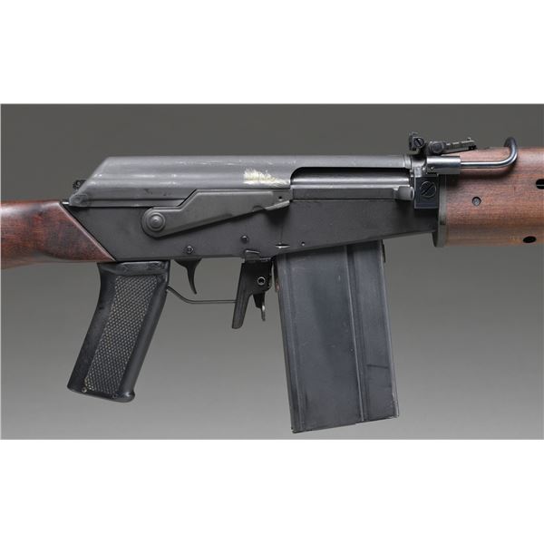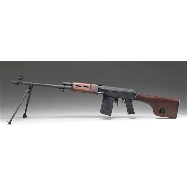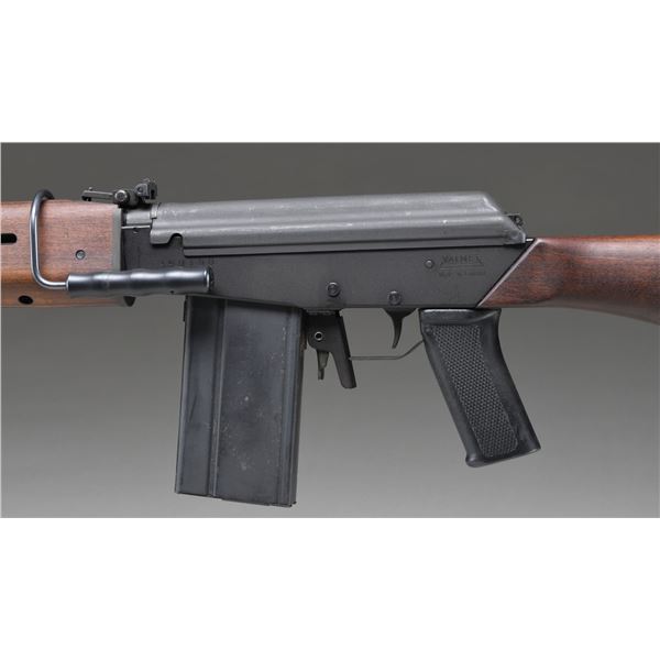Cal. 308 Win. S# 390100. Bbl. 24" with flash hider. Flip-up tritium front sight with hood. Adjustable tritium rear sight. Pre-ban RPK-style Valmet rifle with bipod. Checkered black synthetic pistol grip. Hardwood forend & stock. MAGS: 6-20 rd. UNATTACHED ACCESSORIES: aftermarket softcase with Simmons 3-9x scope & top cover mount. Scope has very good optics & duplex crosshair reticle. CONDITION: furniture shows some light handling marks & a patch of light white staining. Metal retains 92% original parkerized finish with scattered light handling marks, edge wear & some brass wear on top cover behind ejection port. Action functions properly when hand cycled. Very good bore with strong rifling. (25-800/MJC). MODERN. $5000-8000.