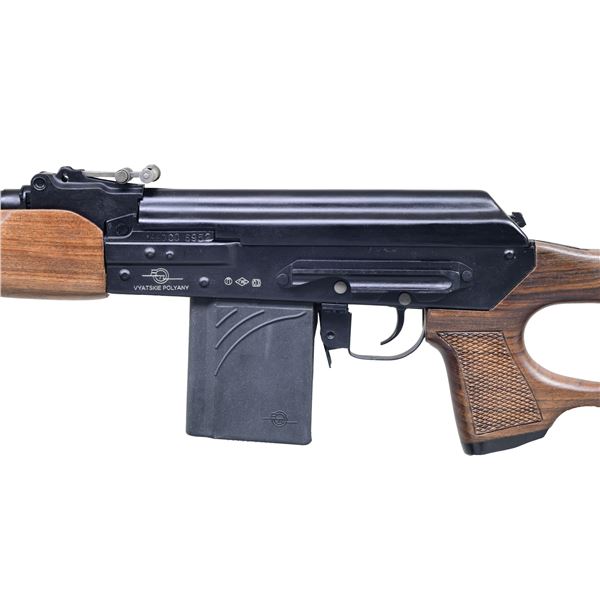 WITH MATCHING FACTORY BOX. Cal. 308 Win. S# 1997CO6952. Bbl. 23 1/4". VEPR semi-automatic rifle chambered in .308 Winchester, mfg. in Russia by BTL in Vyatskie Polyany and imported by ZDF. Left side of the receiver is marked "1997", followed by the S#, above what appears to be a "BTL" logo and "VYATSKIE POLYANY" and Russian proofs. Right side of marked with ZDF's "ZDF SLC UT" import mark, followed by Russian proofs, as well as "MADE IN RUSSIA" above the model and cal. designations. Metal components exhibit a matte black finish overall, save for on the rear sight assembly, which is parkerized. Flat checkered wood thumbhole Monte Carlo buttstock and forend. Open top post front sight, with adj. rear sight graduated 1-3. Left side of the receiver is fitted with a optic side rail. All serialized parts are matching and include the receiver (on trunnion), bolt carrier, bolt, extractor, rear sight ladder, as well as the gas cyl. tube. MAGS: 1 5-rd. and 1 10-rd. black polymer mags. UNATTACHED ACCESSORIES: matching factory box, containing paper wrapped accessories (appear unopened, save for the mags., which were partially unwrapped for inspection). CONDITION: near new, with metal components retaining bountiful amounts of their original factory matte black and parkerized finishes overall. Right side of receiver exhibits a light dragline from cycling of the safety lever. Brilliant mirror chrome lined bore, retaining sharp and well defined rifling throughout. Wood furniture is extremely fine overall. Box shows some light exterior wear from handling and storage, as well as a few holes and small tears, but otherwise remains sturdy and serviceable. A near new example of a Russian VEPR .308 rifle, that one would fine extremely difficult to upgrade from. PROVENANCE: Lifelong Collection of Terrence McCarty. (24-482/MLW). MODERN. $800-1,200.