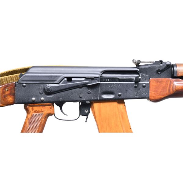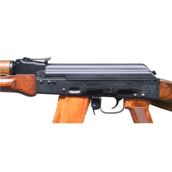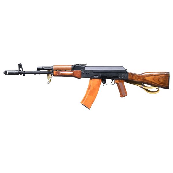 Cal. 5.45x39. S# H12880012. Bbl. 16". Saiga AK-74 variant, made in Russia by Izhmash. Threaded muzzle, currently sporting muzzle brake. Protected post front sight. Elevation adjustable rear sight marked from CQB to 1000 meters. Shaved bayonet lug drilled for storage of onboard cleaning rod (not included). Red tinted, laminated wood forend, heat shield & shoulder stock w/ trap door. Checkered bakelite pistol grip. Stamped receiver w/ left side scope mount. RIght side safety / selector w/ bolt hold open provision. Left side of receiver marked "SAIGA / 5.45x39 / MADE IN RUSSIA BY IZHMASH / LEGION USA INC / HALLANDALE / BEACH FL". Sling swivels, currently sporting tan canvas sling. Tapco USA G2 trigger. MAGS: 1 red bakelite 30 rd. UNATTACHED ACCESSORIES: Tan canvas drop case. CONDITION: Finish is complete & consistent w/ some light thinning on high spots & in areas of mechanical intervention. Bright bore w/ strong rifling. Fire control mechanism appears to function correctly when cycled by hand. (25-544/JZ). MODERN. $2,000-3,000.