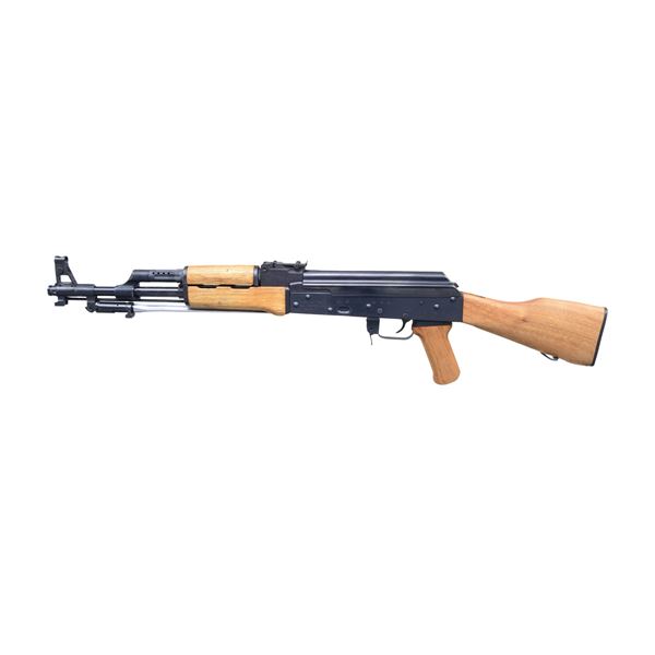 Cal. 7.62x39mm. S# PW85-762-7032. Bbl. 16". The ultimate in 1980s gun culture were the Chinese mfg. AK47 variants that were once so plentiful & inexpensive. The highest quality & most sought after variants were manufactured by Polytech & imported in numerous configurations. As their popularity increased in the United States w/ shooters & collectors & the availability of the once rare 7.62x39mm ammunition became available, we were faced w/ the first of numerous pieces of legislation dealing w/ the propaganda push of the day & firearms w/ similar attributes were branded "assault weapons" & eventually heavily restricted. One of the first new restrictions regarding the semi automatic versions to go into effect was mandated by executive order w/out legislative involvement & banned the importation of guns that didn't qualify as having a sporting purpose. This particular example is a textbook piece w/ its blond hardwood furniture. Stamped receiver. Hooded front sight post & rear sight adj. in elevation to 800m. Safety selector on right side of receiver. Complete w/ its bottom folding spike bayonet, threaded bbl. & flush muzzle brake. Left side of receiver stamped; "MODEL AKS-762 / CAL. 7.62X39MM / SEMI-AUTO / POLY TECH/ BEIJING CHINA." The receiver is marked on bottom, forward of magazine well; " IMPORTED BY: / KFS / ATLANTA GA". Shoulder stock trap door contains original capsule cleaning kit. MAGS: 3 PolyTech 30 rd. UNATTACHED ACCESSORIES: Factory box complete w/ all accessories as shipped, including oil bottle, 3 mags, green canvas sling, mag loader, stripper clips & manual. CONDITION: all outward appearances indicate that this particular example is still as new in box w/ all accessories. Finish coverage is complete & consistent w/ no sign of prior use. Bright bore w/ strong rifling. Fire control mechanism appears to function correctly when cycled by hand. PROVENANCE: Lifelong Collection of Terrence McCarty. (24-481/JZ). MODERN. $1,500-2,200.