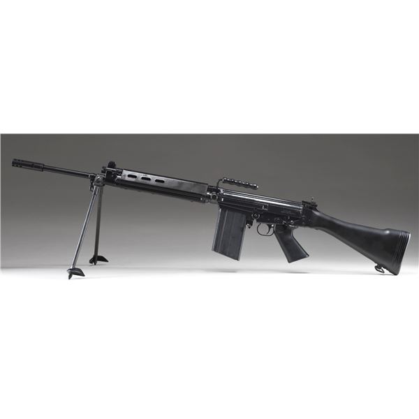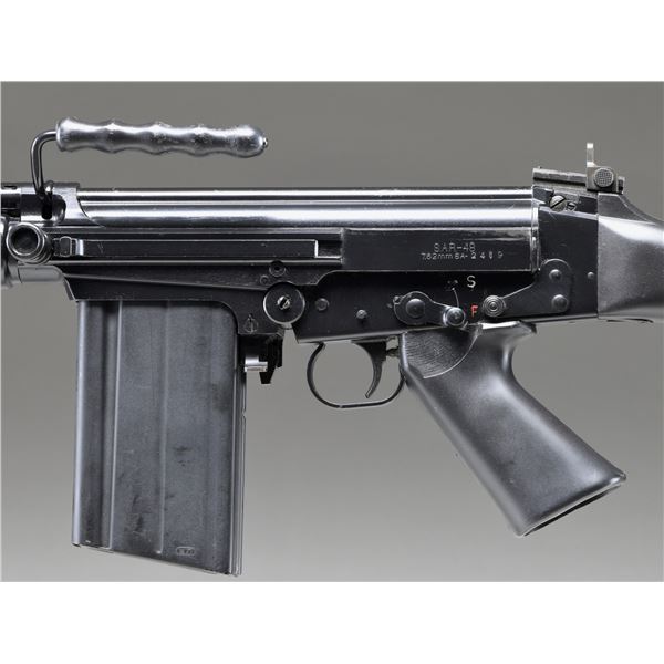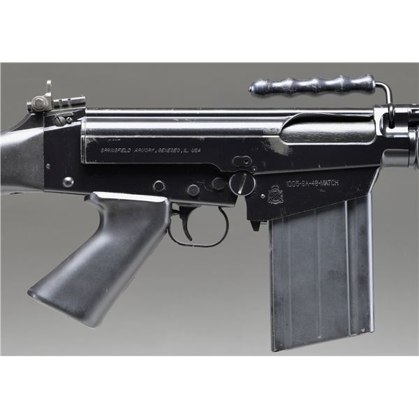 Cal. 7.62X51. S# 2419. Bbl. 22 1/2" including flash suppressor. Nice quality version of the FAL rifle known as the "Right arm of the free world". Manufactured by Imbel and imported by Springfield Armory between 1985 to 1989. The receiver is marked on the left side "SPRINGFIELD ARMORY,GENESEO, IL. USA." Marked over magazine well "Springfield Logo/ 1005-SA-48-MATCH". Receiver ring is marked on bottom "IMBEL/ ITAJUBA/ BRAZIL". Left side marked " SAR-48/ 7.62mm SA-2419". Adjustable aperture rear sight. Post front sight w/ protective ears. Adjustable gas system. Features integral bipod and carrying handle. Black synthetic stock set with the curved comb on the butt. 1 1/4" swivels. MAGS: 2-20rd. steel one has Israeli marking. 2 -20 rd. light weight alloy unmarked. 1-20rd. synthetic "PRO-MAG". UNATTACHED ACCESSORIES: Black plastic padded carrying case. CONDITION: Rifle retains a very large degree of its factory finish with only light hi point wear. Very good shiny bore w/ sharp lands. (25-803/RW). MODERN. $1,200-1,800.