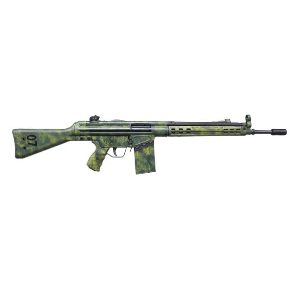 Cal. 308 Win. S# A1107. Bbl. 18". A Portuguese variant of the time honored, roller locked, HK Model 91rifle, built by Fabrica Militar de Portugal (FMP). Originally built w/ a traditional matte black finish, it is currently sporting a yellow, green & brown camouflage finish. Threaded muzzle sporting correct flash hider. Hooded front post sight. 4 position, drum style rear sight Fixed, factory shoulder stock. Slim-line "jungle" forend. Left side, non reciprocating charging handle. Left side sling swivels, front & rear, currently sporting green canvas sling. Rib on top of receiver stamped: "SLG95 A1107 7.62x51". Left side of mag. well stamped "FMP". Right side mag. well stamped: "INTER ORDNANCE OF AMERICA / MONROE, NC. / MADE IN PORTUGAL / ,308 WIN." Steel, clip on, "0-1" ,marked grip frame w/ left side safety / selector. Paddle mag. release as well as push button release. Shoulder stock painted "07" on right side. MAGS: 1 steel 20 rd. CONDITION: Camo finish complete in coverage aside from barrel, cocking handle & tube, & rear sight, which retain a matte black finish. Bore is bright w/ strong rifling. Fire control mechanism appears to function correctly when cycled by hand. (25-536/JZ). MODERN. $1,200-1,800.