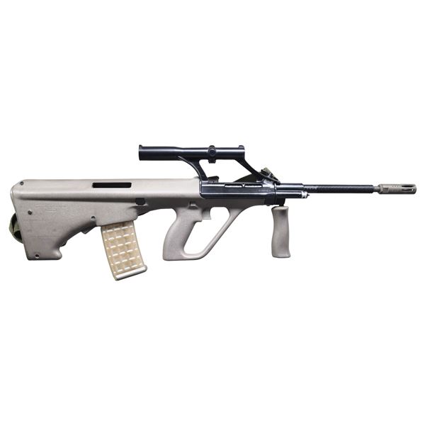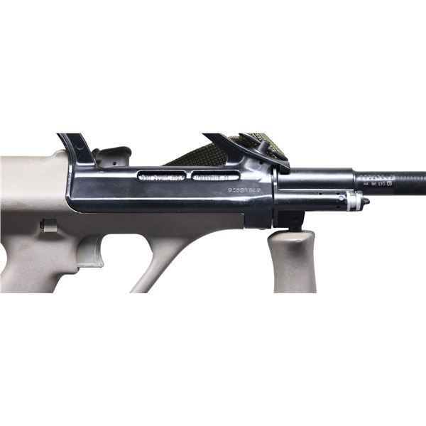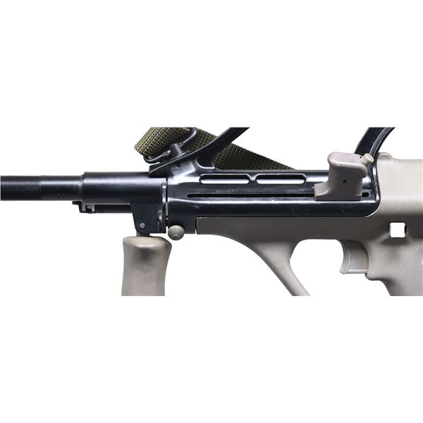 Cal. 5.56mm. S# 905SA849. Bbl. 20" with Fabian Bros. muzzle stabilizer. Integral 1.5x scope with circle reticle & very good optics. Guns South imported Steyr AUG SA rifle with "LTD" proof denoting 1989 mfr. Matte black finished metal. Green polymer stock set with left side sling hardware & green canvas sling. MAGS: 1-30 rd. green. CONDITION: furniture shows scattered light handling marks. Metal retains 95-97% original black finish with some light flaking & handling marks. Action functions properly when hand cycled. Near excellent bright bore. (25-1166/MJC). MODERN. $3000-4500.