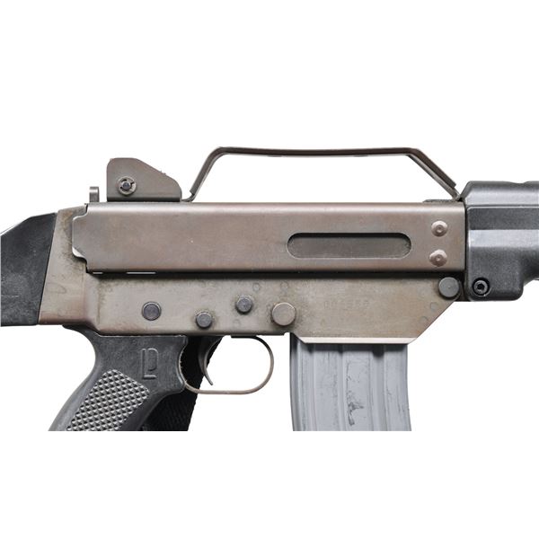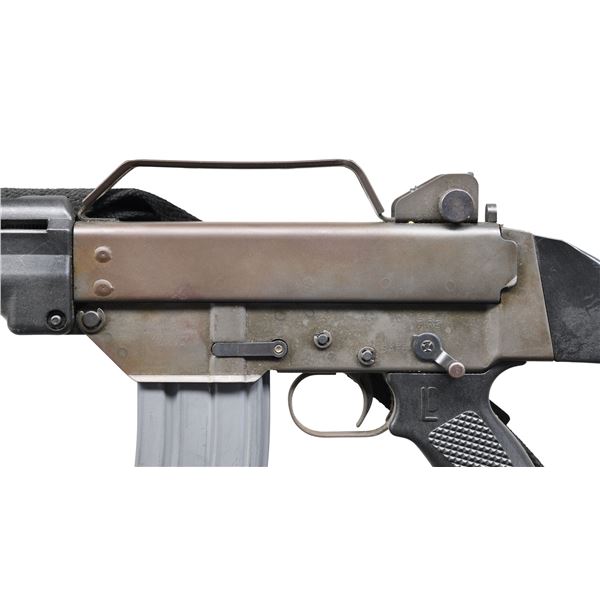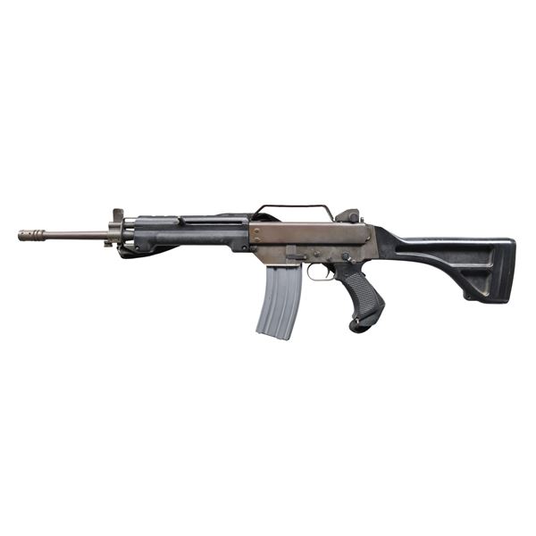 Cal. 5.56mm. S# 001555. Bbl. 17" over muzzle device. Manufactured in the late 1970's the Australian Leader Dynamics, Model T2 Mk5 rifle was introduced as an alternative to the FAL. Published numbers show only 2000 were made available for export so it remains a very rare find in the United States but it did catch the eye of movie producers, making an appearance in such films as Police Academy 5 (1993) & The Matrix (1999). Flat grey parkerized finish on all exposed metal surfaces. Threaded muzzle terminated w/ factory flash hider. Protected blade front sight / gas block / bayonet lug. Left side non-reciprocating charging handle. 3 aperture protected peep rear sight. Crude, flat metal carry handle above receiver. Left side controls. Black plastic Leader Dynamics pistol grip. Fixed black plastic shoulder stock. Sling swivels, front & rear. MAGS: 1 OKay Industries 30 rd. aluminum. CONDITION: Finish consistent throughout, w/ very light speckled patina spread evenly. Bright bore w/ visible rifling. Fire control mechanism appears to function correctly when cycled by hand. PROVENANCE: Lifelong Collection of Terrance McCarty. (24-472/JZ). MODERN. $1,200-1,500.