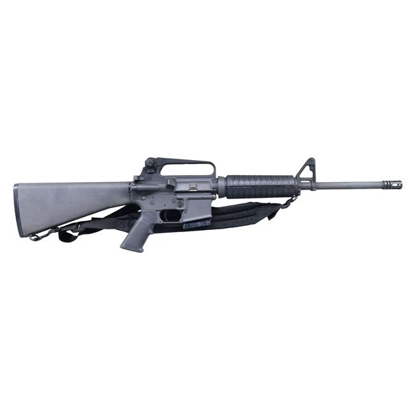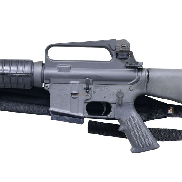 IN FACTORY BOX. Cal. 7.62x39. S# LH009700. Bbl. 16". A beautiful example of a pre-ban, Model 6830, Colt Sporter Lightweight w/ characteristics of pre ban & post ban, which was typical for rifles of this era. 1/12 rifled barrel, threaded & terminated w/ A1 flash hider. Protected post front sight / gas block / sling swivel without the bayonet lug. Carbine length A2 handguards retained w/ tapered delta ring. Carry handle upper receiver w/ windage & elevation adjustable, dual aperture rear sight, round forward assist & brass deflector. Full length shoulder stock w/ trap door. Lower receiver has factory, blind pinned block & rifle utilizes correctly slotted bolt carrier. Black, padded nylon sling. MAGS: 1 MWG 10 rd. CONDITION: Still in matching numbered box. Finish complete & consistent w/ full coverage & very little sign of prior use, even in high traffic areas of mechanical intervention such as brass deflector. Bore is bright w/ strong rifling. Fire control mechanism appears to function correctly when cycled by hand. (25-666/JZ). MODERN. $1,500-2,000.