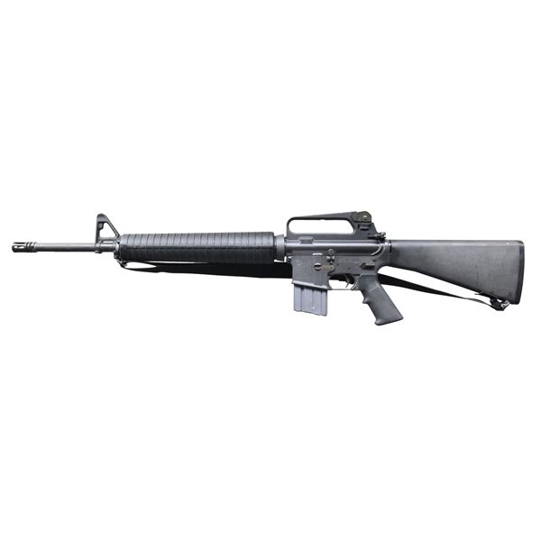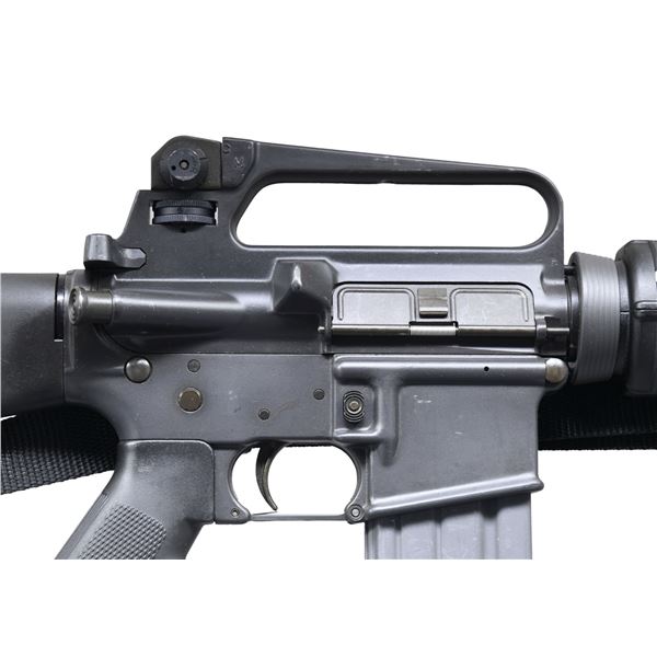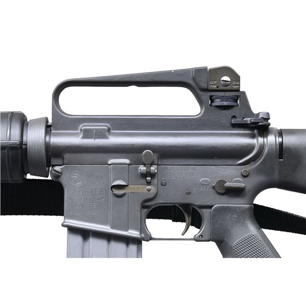 RIFLE. Please note as of 4/11/25 this item description has been updated. Please revisit this description and contact us with any questions. Cal. 223 Rem. S# MH064551. Bbl. 20". A beautiful example of a pre-ban Colt Match HBAR w/ characteristics of pre ban & post ban, which was typical for rifles of this era. 1/7 rifled heavy barrel, threaded & terminated w/ A2 flash hider. Protected post front sight / gas block / sling swived without the bayonet lug. Full length A2 handguards retained w/ tapered delta ring. Carry handle upper receiver w/ windage & elevation adjustable, dual aperture rear sight, round forward assist & brass deflector. Full length shoulder stock w/ trap door. Lower receiver has factory, blind pinned block & rifle utilizes correctly slotted bolt carrier. Black nylon sling. MAGS: 1 Adventure Line 20 rd. CONDITION: Finish complete & consistent w/ full coverage & very little sign of prior use. Even in high traffic areas of mechanical intervention such as brass deflector. Bore is bright w/ descent rifling. Fire control mechanism appears to function correctly when cycled by hand. (24-6747/JZ). MODERN. $1,200-1,800.