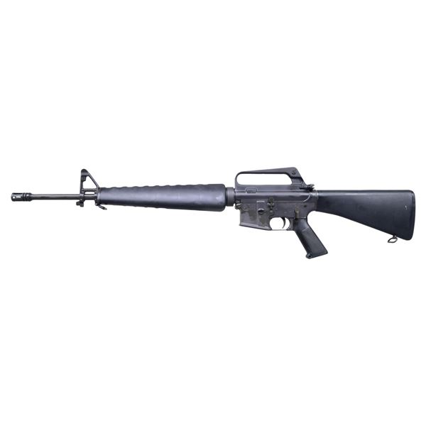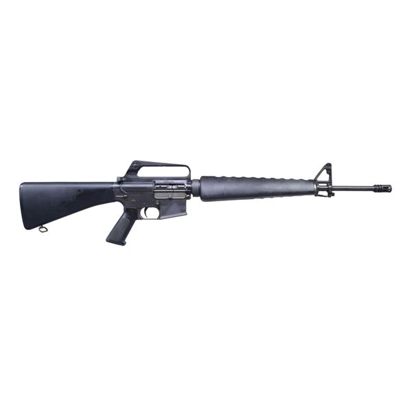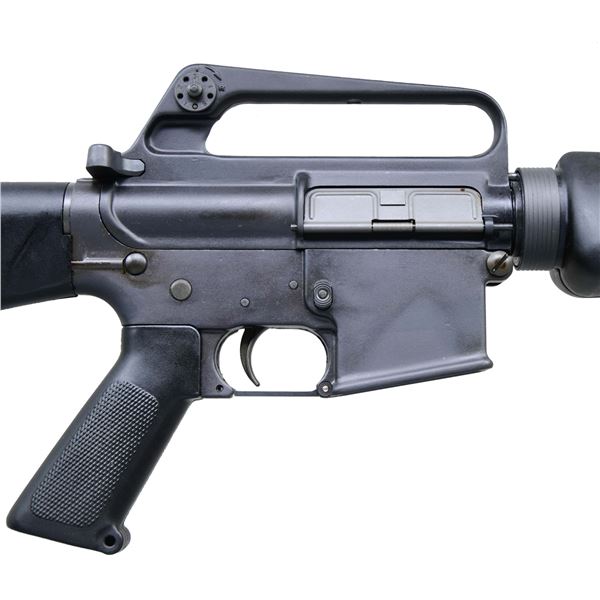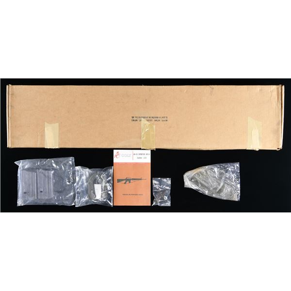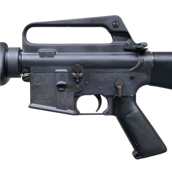 Cal. 223. S# SP28733. Bbl. 20". Manufactured in 1973. Threaded muzzle w/ correct A1 flash hider. Barrel marked "CMP B" rear of muzzle. Protected post front sight / gas block / bayonet lug. Triangular handguards retained w/ strait walled delta ring. Carry handle upper receiver w/ no forward assist or brass deflector. Large front threaded takedown pin. Left side controls. Full length shoulder stock w/ trap door. Standard rifle buffer. SP1 profile bolt carrier. MAGS: 2 Colt 20 rd. still sealed in factory bag. UNATTACHED ACCESSORIES: Original numbered brown cardboard box, cleaning kit, sling & owners manual. CONDITION: All aspects indicate this rifle remains as new in the original box. It was still wrapped in factory plastic when received. All accessories also still remain in their original packaging. Bore is bright w/ strong rifling. Fire control mechanism appears to function correctly when cycled by hand. PROVENANCE: Lifelong Collection of Terrence McCarty. (24-546/JZ). CURIO. $1,500-2,200.