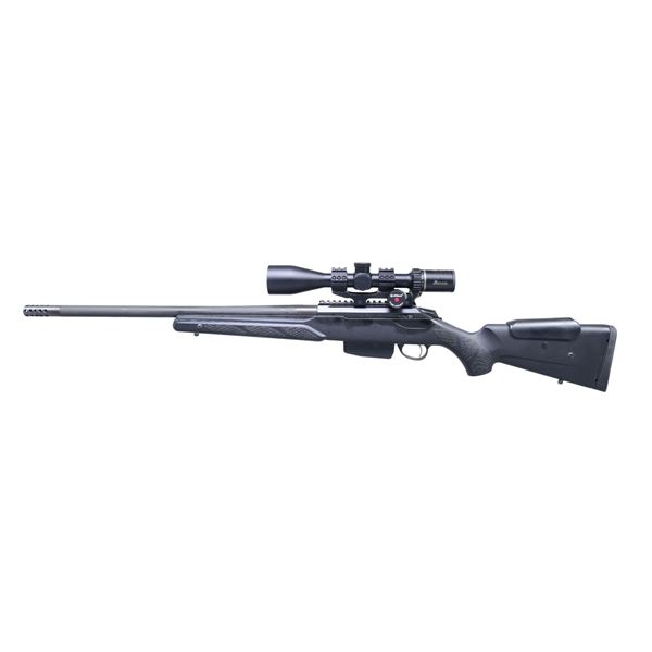 Cal. 308 Win. S# F99634. Bbl. 20" with muzzle brake. Rifle is sighted with Burris Fullfield E1 4.5-14x42 scope. Scope has duplex crosshair reticle with bright very good + optics. Scope is on an Onhunt picatinny mount with a bubble level & picatinny rails on top of rings. Matte gray finish. Black synthetic pistol grip stock with bottom mounted sling studs & adjustable cheekpiece. Pistol grip cap is absent. LOP: 13 7/8". MAGS: 3-5 rd. UNATTACHED ACCESSORIES: matching numbered factory box with aftermarket hardcase, trigger lock, spare buttplate & spare set of sling swivels. CONDITION: stock shows scattered light handling marks. Metal shows some light handling marks & operational wear. Action functions properly when hand cycled. Near excellent bore. (25-807/MJC). MODERN. $600-1000.