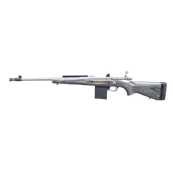 Cal. 308 Win. S# 680-67550. Bbl. 18.7" (20.5" including bird cage flash hider) hammer forged free floating with multiple steps having military style ramped blade front sight with protective ears plus adjustable ghost ring receiver mounted rear sight. Mfg. 2014 (2011 to date) as Model 06822 with catalogue designation of KM77-GS; Ruger's vision of Col. Jeff Cooper's Scout Rifle concept that originated with Cooper and Steyr. Grey and black checkered laminated stock with reinforcement bolts, sling studs, Gunsite logo laser engraved on grip cap and serrated rubber recoil pad adjustable for length of pull with included spacers. Glass reinforced nylon trigger guard assembly for durability. MAGS: 1 AI style factory 10 rd. As Ruger and Col. Cooper say, "the one gun to have if you only have one". UNATTACHED ACCESSORIES: original factory box with packaging to include Ruger scope rings. CONDITION: all aspects near excellent with new, unfired appearance. (25-756/NW). MODERN. $800-1,200.
