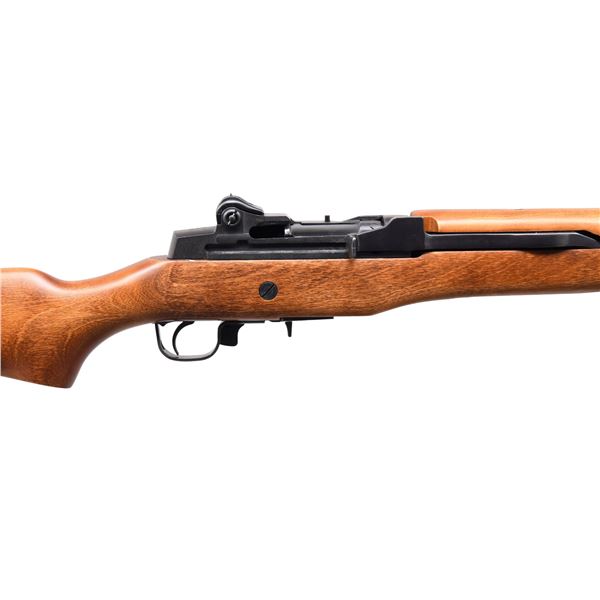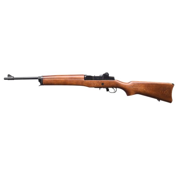 AUTOMATIC RIFLE WITH MATCHING FACTORY BOX, FORMER HENRY RODESCHIN COLLECTION. Cal. 223 Rem. S# 181-00091. Bbl. 18 1/2". Mini-14 semi-automatic rifle mfg. by Ruger in 1977. Left side of the receiver is marked with the S# "181-00091" (with the last two digits being that of Ruger factory employee Henry Rodeschin's personal "91" S#) and Ruger's mfg. information, with "RUGER/ MINI-14/ CAL..223" marked over the top of the receiver at the rear. Metal components exhibit a blue finish overall. Plain wood pistol grip buttstock with an early-patterned wood handguard. Blade front sight with aperture rear sight. MAGS: 1 5-rd. UNATTACHED ACCESSORIES: matching factory box. CONDITION: fine, with metal components retaining bountiful amounts of their original factory blue finish, exhibiting some light wear on the bolt from cycling of the action. Mirror bore, exhibiting well-defined rifling throughout. Stock and handguard are excellent overall. Box shows age related discoloration, with mild wear, tearing, and a few holes, but otherwise remains sturdy and serviceable. An extremely fine Mini-14 rifle, formerly in the collection of longtime Ruger factory employee Henry Rodeschin. PROVENANCE: Amoskeag Auction Company, Auction #136, Lot 1144. (23-6750/MLW). MODERN. $800-1,400.