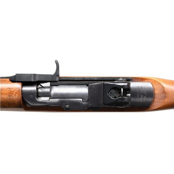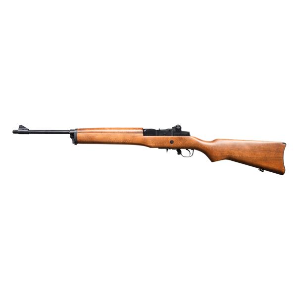 WITH MATCHING FACTORY BOX. Cal. 223 Rem. S# 181-47129. Bbl. 18 1/2". Mini-14 semi-automatic rifle mfg. by Ruger in 1978. Left side of the receiver is marked with the S# and Ruger's mfg. information, with "RUGER/ MINI-14/ CAL..223" marked over the top of the receiver at the rear. Metal components exhibit a blue finish overall. Plain wood pistol grip buttstock with smooth wood handguard. Blade front sight with black enamel-finished aperture rear sight. MAGS: 1 5-rd. UNATTACHED ACCESSORIES: matching factory box. CONDITION: extremely fine, with metal components retaining bountiful amounts of their original factory blue finish, exhibiting some very light wear on the bolt and on the right side of the receiver from cycling of the action. Mirror bore, exhibiting sharp and well-defined rifling throughout. Wood furniture is excellent overall. Box shows moderate wear, exhibiting several holes, tears, and a taped repair. (23-6784/MLW). MODERN. $500-1,000.