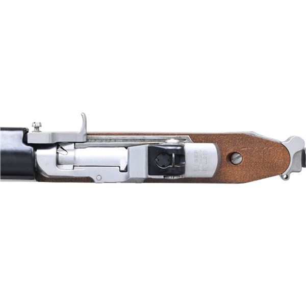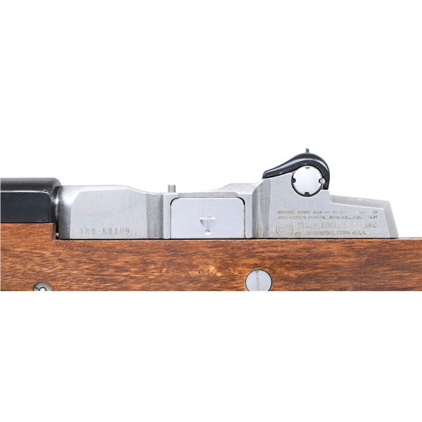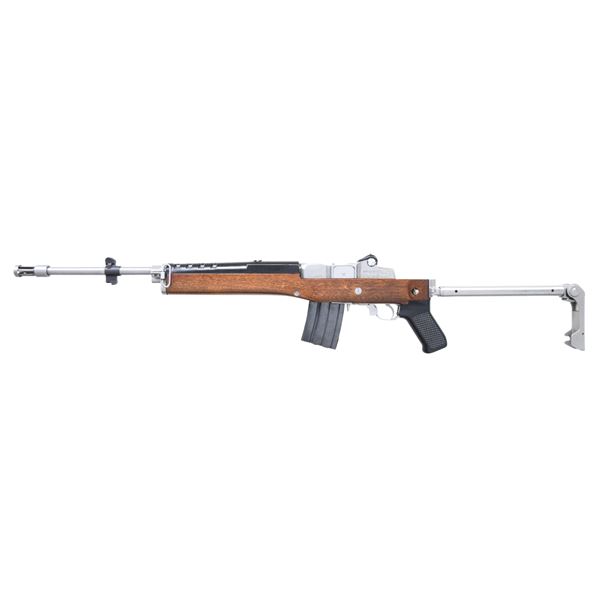Cal. 223 Rem. S# 183-58109. Bbl. 18 1/2" plus addition of bird cage flash hider and bayonet lug. Mfg. 1983 (1974 to date for all Mini's) as desirable stainless GBF (Government Bayonet Folder) model having folding stock plus special gas block with sling swivel mounted on left side rather than on bottom. This is the same model used by Mr. T on the television series "A-Team". MAGS: 1 factory 20 rd. (curved). UNATTACHED ACCESSORIES: original box (slight tear on one edge) with factory black nylon sling; missing manual and Uncle Mike's detachable swivel for left rear side of stock. CONDITION: all aspects near excellent appearing new and unfired. (23-6794/NW). MODERN. $1,000-1,500.
