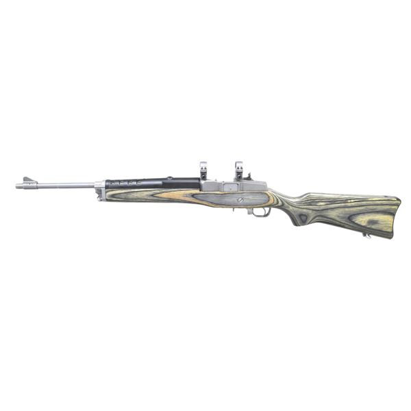 Cal. 223 Rem. S# 188-51219. Bbl. 18 1/2" with banded serrated blade front sight; folding leaf peep sight on receiver. Factory machined for attached Ruger 1" scope rings. Mfg. 1992 (1982 to date for Ranch Rifles) with normal later factory features of round wire sling swivels, black laminated hard wood stock, black Celcon carbine buttplate, no roller on bolt lug, black fiberglass handguard and latest internal style bolt hold open latch. MAGS: 1 fair factory 5 rd. with light oxidation and inability to function hold open latch. UNATTACHED ACCESSORIES: original box and packaging. CONDITION: couple of very minor handling marks on stock; all other aspects near excellent including bore. (23-6538/NW). MODERN. $700-1,000.