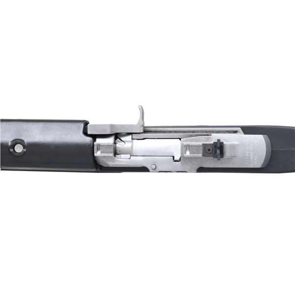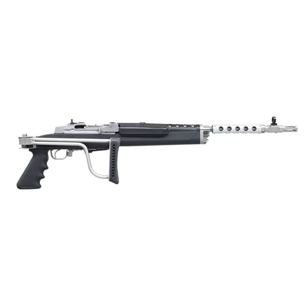 RIFLE. Cal. 223 Rem. S# 196-07485. Bbl. 18 1/2" with aftermarket aluminum ventilated barrel shroud plus stainless flash hider with HK style front sight in place of standard sight. Mfg. 2000 as KMini-14/5R now fitted with discontinued Butler Creek folding stock. Receiver factory machined for Ruger scope rings; fitted with simple factory dovetailed peep sight. Factory black fiberglass ventilated handguard. MAGS: 1 factory 5 rd. CONDITION: missing peep sight blade; all other aspects near excellent including bore. (23-6319/NW). MODERN. $500-750.
