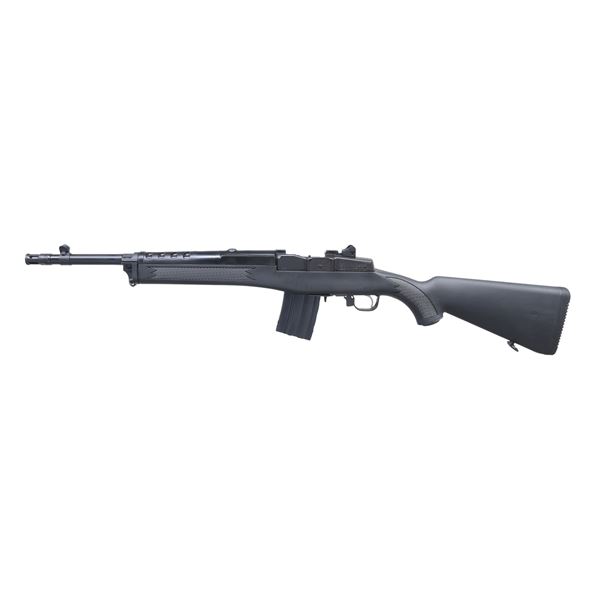 Cal. 300 Blackout. S# 583-27204. Bbl. 16 1/8" bull having factory bird cage style flash hider and banded front sight with protective ears plus ghost ring style receiver sight. Mfg. 2015 (1974 to date for all Mini's) as Model 05864 having catalog designation of M-14/30GBCPC with latest features of heavy hammer forged bull barrel for accuracy, military style front sight, receiver drilled and tapped for addition of Ruger Picatinny base in addition to provision for Ruger scope rings, stainless trigger guard components plus checkered black Zytel stock having swivels and black serrated rubber pad. MAGS: 2 factory Nickel Teflon plated 20 rd. with white caliber marking on sides. UNATTACHED ACCESSORIES: original box with packaging to include Ruger Picatinny base and 1" scope rings. CONDITION: all aspects near excellent appearing new and unfired. (24-3352/NW). MODERN. $750-1,000.