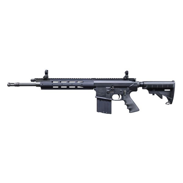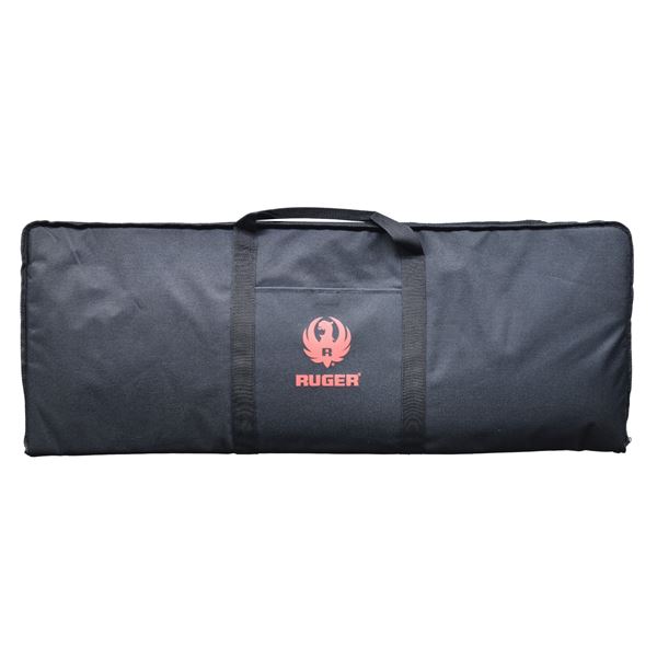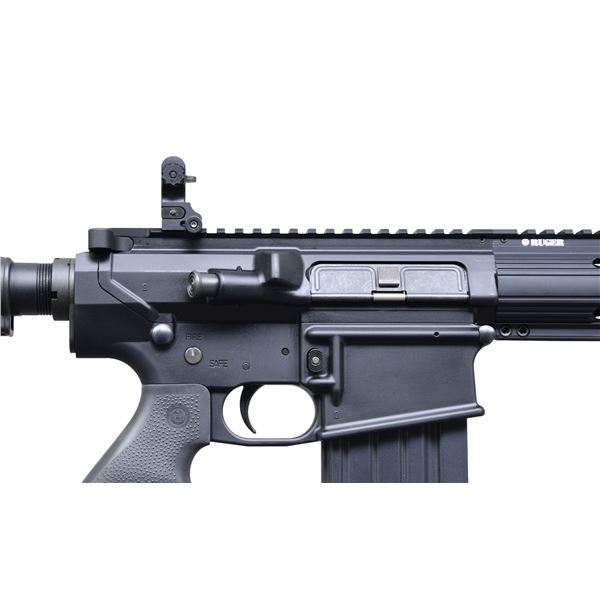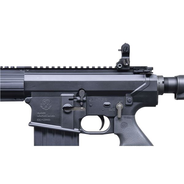 SHIPPING BOX, SOFT CASE, & MATCHING FACTORY BOX. Cal. 308 Win. S# 561-03983. Bbl. 16 1/2". SR-762 semi-automatic rifle mfg. by Ruger in 2013. Left side of the receiver is marked with the Ruger logo above Ruger's mfg. information and the S#, with "SR-762" marked towards the safety lever. Metal components exhibit a black anodized finish overall, save for on the bbl. and gas block, which exhibit a parkerized finish. Black polymer collapsible buttstock, with textured Ruger logo black rubber pistol grip. Ruger flip-up post front sight and rear sights. Grooved handguard is drilled and tapped for rail segments and/or rail covers. Bird cage flash hider. MAGS: 3 DPMS 20-rd. mags. UNATTACHED ACCESSORIES: shipping box, matching factory box, black factory soft case containing factory paperwork, mags., as well as factory rails / rail covers. CONDITION: near new, with metal components retaining virtually all of their original factory finishes overall. Mirror bore, exhibiting scattered spots of grease, while retaining well defined rifling throughout. Black polymer and rubber furniture are excellent overall. Box and shipping box are excellent overall. (23-6861/MLW). MODERN. $1,000-1,500.