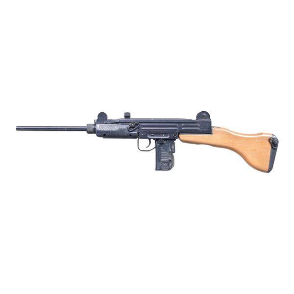 CARBINE. Cal. 9x19mm. S# SA53080. Bbl. 16 1/8". Uzi Model B semi-automatic carbine mfg. in Israel by IMI and imported by Action Arms. Left side of the receiver is marked "UZI semi auto/ MODEL B/ 9mm PARA/ IMI - ISRAEL", with Action Arms' importer information and the S# marked on the right. Receiver, receiver cover, trigger housing, and bbl. exhibit a black enamel type finish, with the bolt and buttstock iron exhibiting a parkerized finish. Grips and forend are comprised of grooved black polymer. Solid wood buttstock, with grooved black enamel finished buttplate. Model B pattern front and rear sight, with Model B pattern 360 degree sling swivel. Mag. is absent. CONDITION: very good, with metal components retaining the majority of their original black enamel finish, exhibiting some scattered handling marks and some spots of light to mild wear. Mirror chrome lined bore, retaining well defined rifling throughout. Black polymer furniture and wood buttstock show some scattered marks from handling and storage, but otherwise remain sturdy and serviceable. PROVENANCE: Lifelong Collection of Terrence McCarty. (24-422/MLW). MODERN. $1,000-1,500.