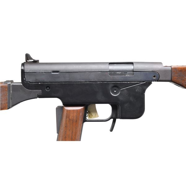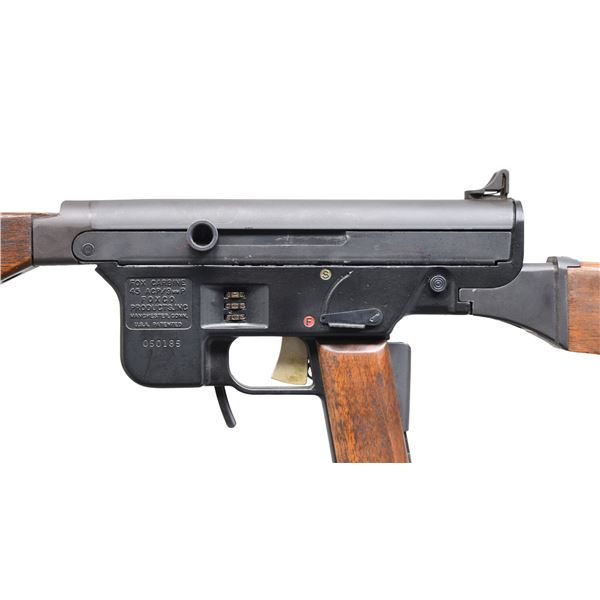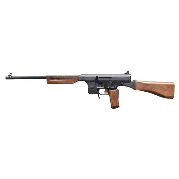 Cal. 45 ACP. S# 050185. Bbl. 17". Mfg. 1975-1976. An open bolt, self loading rifle w/ a few unique features. Designed by Gerard J. Fox in 1974, the FOX carbine somewhat resembled a Thompson Submachine Gun though is an entirely different mechanism. One of the most unusual features is that this carbine utilizes 3 distinctly different safety mechanisms; the first is a traditional safety lever, located on the left side of the receiver, the second is a grip safety, like a Colt Model 1911 uses, & the 3rd is a Sesamee, 3-digit keyless lock, integral to the left side of the receiver. Parkerized finish. Hardwood forend, shoulder stock & pistol grip panels. The Grip panels are secured by attached ball & post plastic pads, glued to each grip for easy disassembly. The shoulder stock is terminated w/ a brass butt plate. It is fed w/ unmodified US M3 Grease Gun magazines. Round barrel w/ 18 ribs. Blade front sight w/ fixed protected peep sight in the rear. The stock detaches by depressing a button at the rear of the receiver & pulling it to the rear. CONDITION: Finish is complete & consistent w/ a few scratches & rub marks typically earned through vertical rack storage. Wood furniture has only a few light impressions & matches in finish nicely. Bright bore w/ strong rifling. Fire control mechanism appears to function correctly when cycled by hand. PROVENANCE: Lifelong Collection of Terrance McCarty. (24-596/JZ). MODERN. $1,000-1,500.