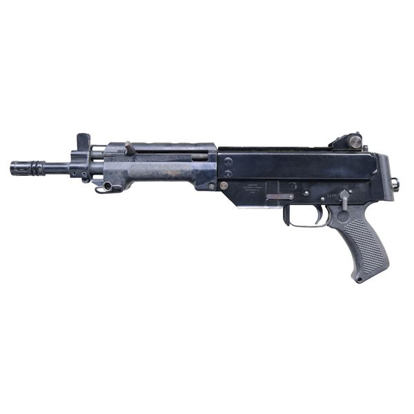 PISTOL. Cal. 5.56 S# SAP101121. Bbl. 11". A scarcely found example of an entire industry that ceased normal operations, following wide, sweeping over-regulation in 1996 in Australia. Originally manufactured starting in 1978, as the Leader Dynamics rifle, the patent was acquired by Australian Automatic Arms in 1993, bringing 4 new configurations to the market w/ improvements to earlier design issues. Steel construction w/ black polymer furniture. The operating system is a short stroke gas piston, utilizing a tri-lug bolt w/ dual return springs & operating rids, similar in design to some modern bullpup systems. Threaded muzzle, terminated w/ A1 style flash hider. Left side front sling swivel & center rear swivel. Protected blade front sight w/ 3 position, windage adjustable, diopter-style rear sight. Left side, non reciprocating charging handle. Left side safety selector. Top of receiver has a 6" rail section similar to a weaver rail, without the horizontal slots. Imported by California Armory of San Bruno, CA. CONDITION: Original finish is complete & consistent w/ very little sign of actual use. Bright bore w/ strong rifling. Fire control mechanism appears to function correctly when cycled by hand. PROVENANCE: Lifelong Collection of Terrance McCarty. (24-485/JZ). MODERN. $1,000-1,500.