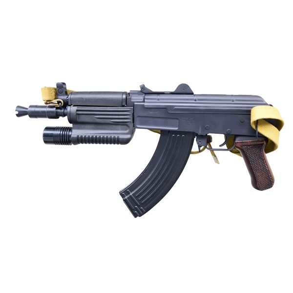 7.62x390MM PISTOL. Cal. 7.62x39mm. S# FLB0201. Bbl. 8.25". Barrel threaded 24x1.5 RH & terminated w/ cone flash hider. Milled receiver. Matte black finish on all exterior metal parts. Protected post front sight. Spring assisted, hinged top cover, sporting dual aperture rear sight. Black, plastic forend / flashlight combo w/ pressure switch on right side. Checkered, wood pistol grip. Right side reciprocating charging handle. Right side safety / selector. Left side sling swivels, currently sporting tan, canvas sling. MAGS:1 steel Korean 30 rd. CONDITION: All aspects indicate very little use, if any. Finish is complete & consistent, even in areas of mechanical intervention, such as between selector & receiver where it usually thins immediately. Bright bore w/ strong rifling. Fire control mechanism appears to function correctly when cycled by hand. (25-538/JZ). MODERN. $1,500-2,500.