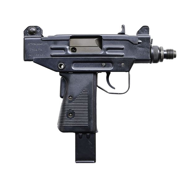 Cal. 9mm. S# UP00607. Bbl. 4 1/2". Action Arms Ltd./IMI UZI pistol. Semi automatic variant of the exotic micro UZI SMG. 3 Dot sight system. Elevation adj. protected post front sight. Windage adj. rear sight. Slotted, non reciprocating top mounted charging handle. Classic black painted finish on most exposed metal parts. F-S trigger group. Black plastic furniture. MAGS: 1 factory 25 rd. UNATTACHED ACCESSORIES: Action Arms blue plastic transport case. CONDITION: Finish on all exposed parts remains complete & consistent. Very little sign of prior use aside from modified, threaded barrel. Bore is bright w/ strong rifling. Fire control mechanism appears to function properly when cycled by hand. PROVENANCE: Lifelong Collection of Terrance McCarty. (24-260/JZ). MODERN. $900-1,400