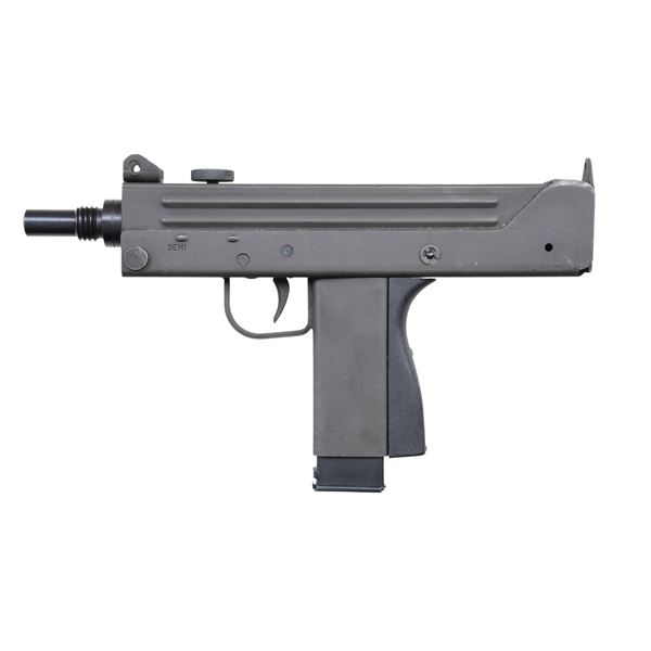 Cal. 9x19. S# 88-0011903. Bbl. 5.1/4". A closed bolt hammer fired semi automatic version of the infamous M11 SMG. Black parkerized finish on exposed metal surfaces. Protected post non adj. front sight. Non adj. rear peep sight. Other than a few subtle differences such as the absence of stock slots & a selector on the left side of the receiver, it is almost indistinguishable in appearance, from its famous full auto sibling. Emblemized w/ the Cobray logo on the right side of the lower receiver & top portion of upper receiver, this particular gun was manufactured by S.W.D. Inc. in Atlanta, GA. MAGS: 1 Zytel 12 rd. UNATTACHED ACCESSORIES: Soft black, nylon transport pouch. CONDITION: Finish complete & consistent, bearing a small rub spot where finish is thinned on bottom of lower receiver, behind pistol grip. Bright bore w/ descent rifling. Fire control mechanism appears to function correctly when cycled by hand. (25-1007/JZ) MODERN. $500-800.