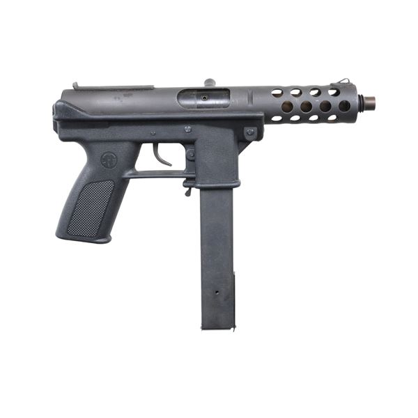 Cal. 9mm. S# 124613. Bbl. 5". Interdynamic of Sweden originally mfg. the KG-9 in its semi auto configuration as a simple blowback operated, open bolt design. Following the 1982 BATF ruling outlawing open bolt semi auto firearms, they were redesigned as a striker fired, closed bolt system & designated the KG-99. The U.S. based branch located in Miami, FL eventually changed company name to Intratec where they marketed it as the Tec-9, later changing to the DC-9. Following the Federal knee jerk reactionary assault weapons ban, changes were made to comply such as mfg. the bbl. w/out threads at the bore where it was rebranded once again as the AB-10 ("AB" is After Ban). This example is the original TEC-9. With a polymer frame & tubular upper receiver extended to the front, as a ventilated bbl. shroud. It was generally regarded as heavy & awkward in its configuration as a semi automatic pistol though it gained popularity largely due to the media induced disinformation & hyperbole combined w/ it being a favorite "boogeyman" of the anti gun groups simply due to its aesthetics. Fixed sights permanently attached to receiver. The safety is built into the charging handle & engaged by pressing it in w/ the bolt in the closed position. Matte black finish on exposed metal surfaces. Polymer receiver is injection molded black in color. Mag. release is located below the trigger to the rear of the mag. well. Bbl. shroud conceals bbl. threads which may be utilized to accommodate several muzzle accessories. MAGS: 1 metal 36 rd. UNATTACHED ACCESSORIES: Factory black plastic transport box w/ owners manual. CONDITION: finish on exposed metal surfaces is complete & consistent though it has earned some light patina, obvious under close inspection. Plastic receiver section bears very little evidence of actual use. Bore is shiny w/ strong rifling. Fire control mechanism appears to function correctly when cycled by hand. (25-1591/JZ). MODERN. $500-800.