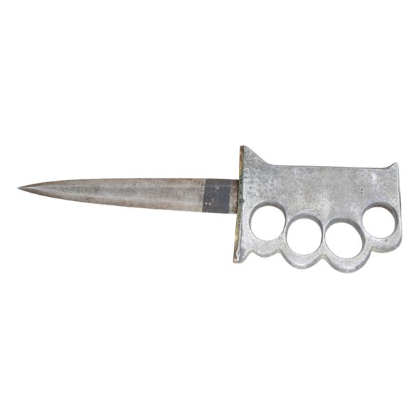 KNIFE WITH TOOLED SHEATH. Custom U.S.G.I. theater made fighting knife, produced during World War II. The dagger type blade measures 6 1/2" from the point to the brass plate at the top of the grip, with an overall length of 11". Handle is comprised of a solid piece of aluminum. Left side of blade is painted with a black band. UNATTACHED ACCESSORIES: period tooled brown leather sheath marked "TEXAS" on the front. CONDITION: blade retains a gray patina, exhibiting areas of light to mild pitting and areas of discoloration. Blade edge shows a couple of nicks. Brass plate retains a dark brown patina, with the aluminum grip retaining a dark gray patina. Sheath remains malleable, exhibiting some wear, as well as some spots of age related cracking and crazing. (02-24416/MLW). $700-1,100.