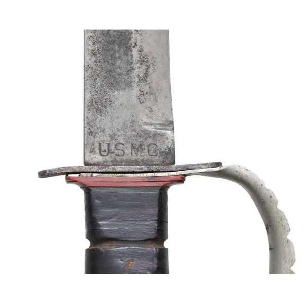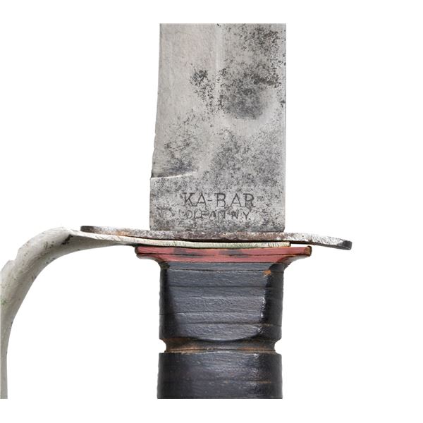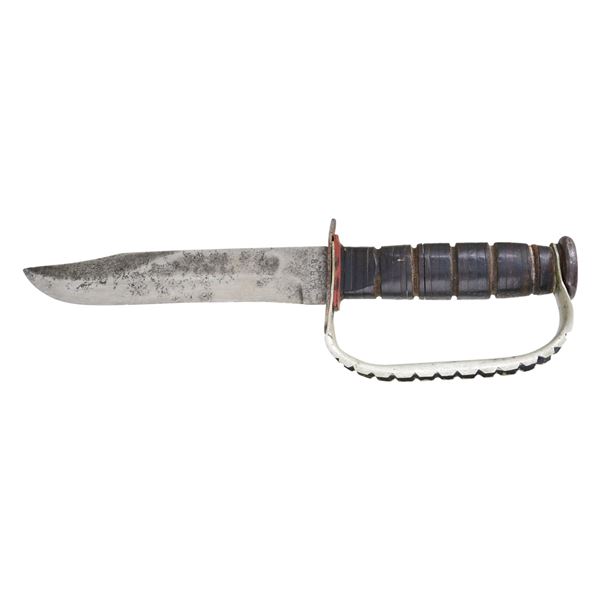 MARK II FIGHTING / KNUCKLE KNIFE WITH SHEATH. Early pattern USMC KA-BAR Mark II knife, likely customized during the period. Left side of the ricasso is marked "KA-BAR/ ORLEAN. NY.", with "USMC" marked on the right. The clip point blade measures 6 7/8" from the point to the bottom of the ricasso, with an overall length of 11 7/8". Leather washer handle with red spacers present at the guard. Knife features a period added serrated aluminum knuckle bow that exhibits a black painted finish. UNATTACHED ACCESSORIES: brown leather sheath. CONDITION: blade retains a gray patina overall, exhibiting areas of moderate pitting, a few nicks to the blade face, as well as some striations from prior cleaning. Knuckle guard bow retains fair amounts of its black painted finish with the balance remaining in-the-white. Handle shows some separation to the leather washers, as well as some marks from handling and storage, but otherwise remains sturdy and serviceable. Sheath shows wear, scattered handling marks, as well as some areas of crazing. (02-24399/MLW). $700-1,000.