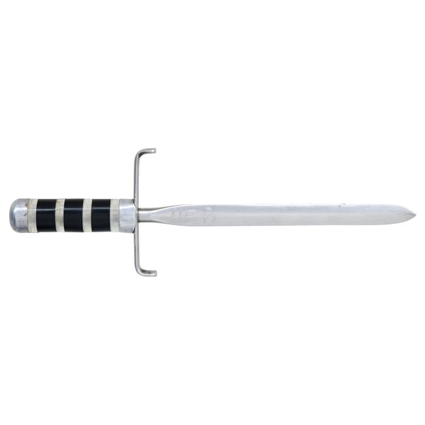 KNIFE, WITH BRONZE STAR CERTIFICATE. U.S.G.I. custom theater made knife, fabricated during World War II. The right side of the blade is lightly etched "HEB" (Herbert E. Brown). The dagger type blade features a polished finish, measuring 8 1/8" from the point to the top of the guard, with an overall length of 11 5/8". Handle is comprised of black and transparent synthetic rings, featuring an aluminum upturned full cross guard, aluminum bolster, and aluminum pommel. UNATTACHED ACCESSORIES: framed 1986 reissued Bronze Star certificate presented to PFC. Harold E. Brown of the United States Army for a meritorious achievement in ground combat during World War II. CONDITION: blade retains a bright appearance, exhibiting superficial handling marks, as well as some sharpening marks. Grip shows some superficial marks from handling and storage, but otherwise remains sturdy and serviceable. (02-24401/MLW). $200-400.