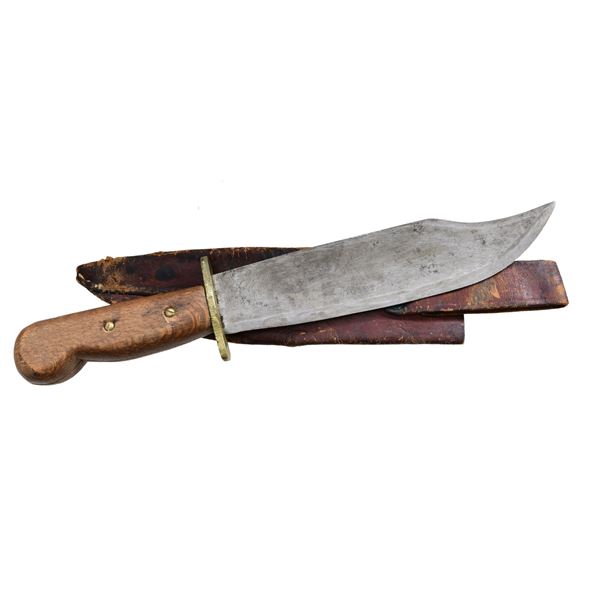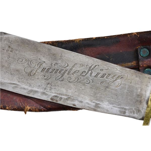 BOWIE KNIFE, MADE FOR LEVENSONS RADIO, WITH SHEATH. The left side of the blade is engraved with light scroll pattern engraving surrounding "Jungle King", with "Made for "Levensons/ Radio/ 22b Pitt St/ Sydney" marked on the right. The blade measures 8 5/8" from the point to the bottom of the ricasso, with an overall length of 13 7/8". Handle is comprised of 2 smooth wood scales, each retained by 2 brass screws, with a brass full guard. UNATTACHED ACCESSORIES: unmarked brown leather sheath. CONDITION: blade retains a gray patina, exhibiting light to mild pitting and areas of age related discoloration overall, with sharpening marks present on the blade edge. Guard exhibits a pleasing mellow patina. Grip scales are good, showing some chipping around the bottom screw slots, with some superficial handling marks overall. Sheath remains malleable, exhibiting wear, age related cracking & crazing, as well as several holes of varying sizes. (02-24413/MLW). $1,000-2,000.