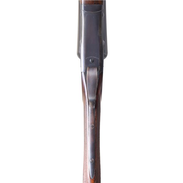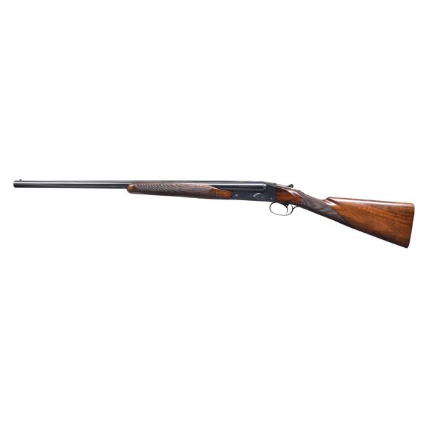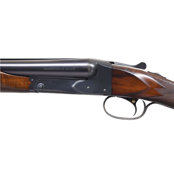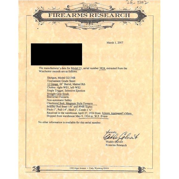 Cal. 12 ga. 2 3/4". S#. 3824. Bbls. 26", fixed WS-1 & WS-2 chokes. Red target front sight w/ white mid bead. Blue finished boxlock action. Features include SST, ejectors, & non-automatic safety. Beavertail forearm and straight grip stock of nicely grained walnut with kidney pattern checkering. LOP: 14" to a checkered butt. DAC: 1 1/2". DAH: 2". Weight: 7lbs 3.4oz. UNATTACHED ACCESSORIES: Waddy Colvert Firearms Research letter dated March 1, 2007 stating this is manufacturer's data for Model 21, serial number 3814, extractted from the Winchester records as follows: "Shotgun, Model G2136B", "Tournament Grade Skeet", "12 Gauge, 26" Barrel, Matted Rib", "Chokes: right-WS1, left-WS2", "Single Trigger, Selective Ejection", "Straight Grip Stock", "Beavertail Forearm", "Non-automatic Safety", "Checkered Butt, Magnum Style Forearm", "Bradley Red Bead 1/8" and #94B Sights", "Pitch-1", Pull-14", Heel-2", Comb-1 1/2" ". Received in the warehouse April, 27, 1934 to: W.F. Evans", "no other information is available for this serial number". CONDITION: 90% original blue showing light fading and carry wear. Wood has lightly worn original finish and checkering showing scattered scratches and marks. Top lever sits right of center. Very good bores. (25-1292/DS). CURIO. $3,000-4,500.