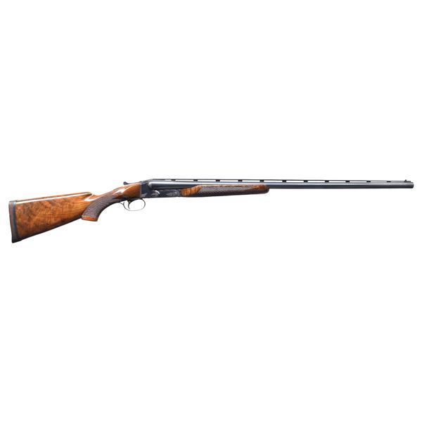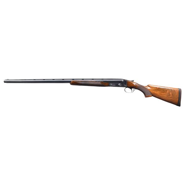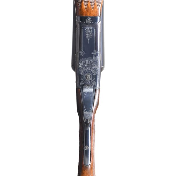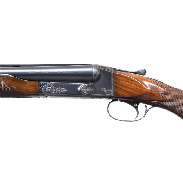 SXS SHOTGUN. Cal. 12 ga. 3". S# 10342. Bbls. 30" w/ Simmons large oval post aftermarket vent rib. Full & Full chokes. White target front sight w/ white mid bead. Action has custom style three engraving, featuring a mountain scene w/ a pointing setter on the floorplate. Balance of action has fancy borders w/ scroll highlights. SST. Selective ejectors. Beavertail forearm & pistol grip stock of fancy walnut have point pattern hand checkering. LOP: shortened to 13 1/2" over a reproduction solid red Winchester pad. DAC: 1 1/2". DAH: 2 1/2". Stock has a slight cast off. WEIGHT: 7 lbs, 6.4 oz. CONDITION: bbl. & action retain 90% lightly worn reblued finish. Bbl markings are weakened from polishing. Stocks has a gloss refinish w/ freshened checkering. Bbl. under rib shows evidence of resoldering, w/ five drilled holes. Ejectors are out of time. Bores show areas of light pitting. (25-796/DS). CURIO. $3,000-4,000.