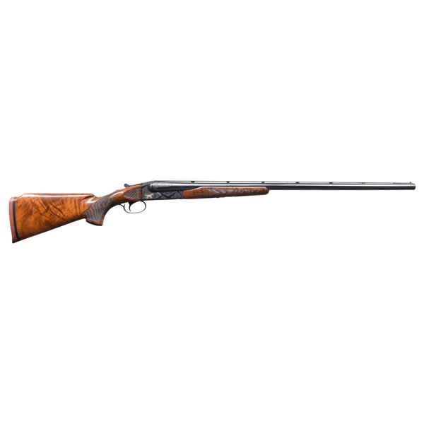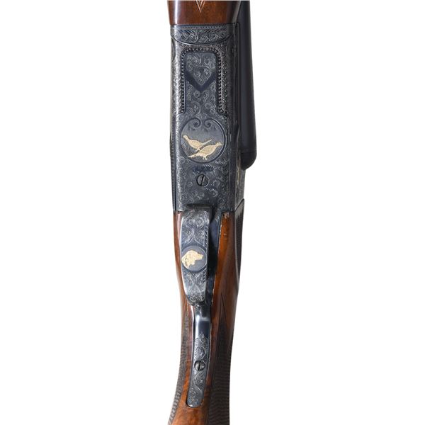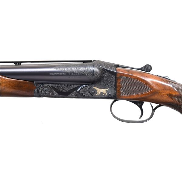 SXS SHOTGUN. Cal. 12ga 2 3/4". S# 23183. Bbls are 30" vent rib w/ fixed IMP MOD and FULL chokes. Blued boxlock action has custom aftermarket Style 6 hand engraving. Engraving features scenes w/ gold pointing dogs on both sides, two gold pheasants on floorplate and gold dog portrait on trigger guard. Balance of action, forearm and breech end of bbls have vine type foliate scroll w/ fancy borders. Features include SST, selective ejectors and non-automatic safety. Original beavertail forearm w/ point pattern checkering. Custom Monte Carlo stock of fancy walnut w/ Bishop plastic grip cap. Wrist of stock has point pattern hand checkering w/ additional checkering on stock ears. LOP: 13 3/4" over reproduction solid red Winchester pad. DAC: 1 1/2". DAMC: 1 3/8". DAH: 1 7/8". Stock has approx 1/4" cast on. WEIGHT: 8lbs. CONDITION: bbl and action retain over 97% reblued finish. Forearm has lightly worn original finish and checkering showing handling marks and light dents. Stock has good finish and checkering showing a few small marks. Action is tight w/ top lever sitting nicely right of center. Bbl selector on trigger will not shift to left bbl. Rear vent rib post has replacement pin. Very good bright bores. (25-1396/DS). CURIO. $3,000-4,500.