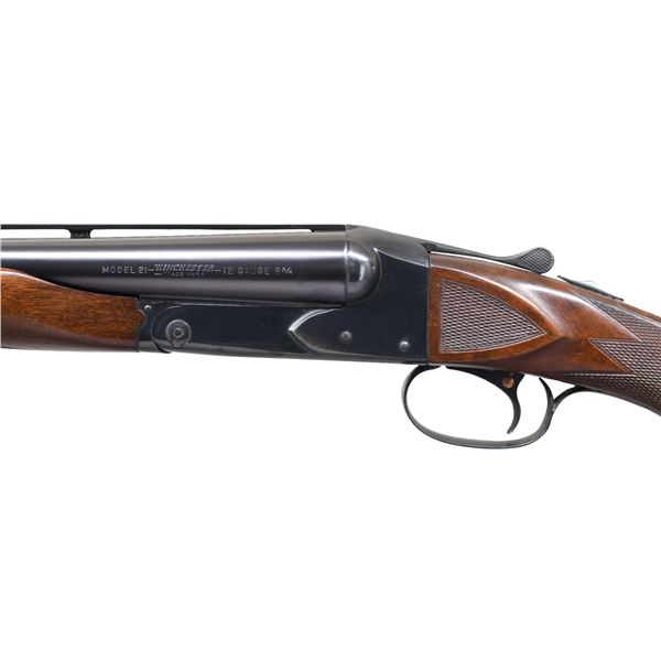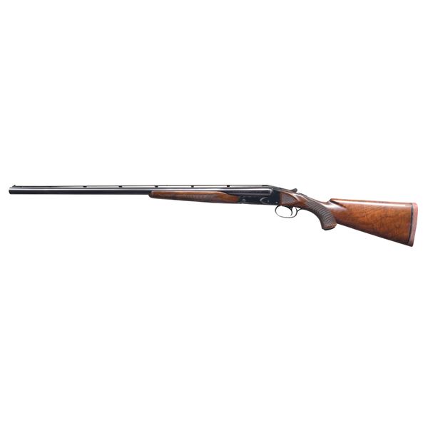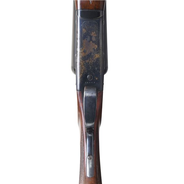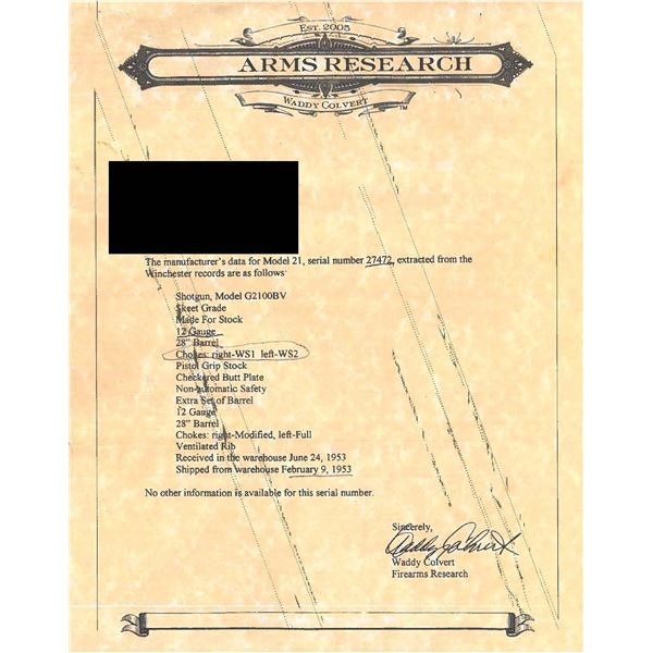 SHOTGUN. Cal. 12 ga. 2 3/4". S# 27472. Bbls. 28" factory vent rib w/ fixed WS-1 & WS-2 chokes. White target front sight w/ white mid bead. Blued boxlock action. Features include SST, ejectors, & non-automatic safety. Floorplate is marked "SKEET". Beavertail forend & steel capped pistol grip stock of fancy black walnut have point pattern checkering w/ additional checkering on stock ears. LOP: altered to 14 3/8" over an after market solid red Winchester pad. DAC.1 1/2". DAH. 1 15/16". WEIGHT: 7 lbs., 13 oz. UNATTACHED ACCESORIES: Waddy Colvert Firearms Research letter dated March 1, 2007. "Shotgun, Model G2100BV / Skeet Grade / 12 Gauge / 28" Barrel / Chokes: right-WS1, Left-WS2 / Pistol Grip Stock / Non-automatic safety". The letter also lists a 2nd set of bbls. that are not with the gun. CONDITION: over 95% bbl. blue. Action has 70% blue showing edge & carry wear w/ spotted flaking to brown on the floor plate. Stocks show light finish wear w/ scattered scratches, marks & mildew spots. Top lever sits slightly left of center. Very good bores. (25-1291/DS). CURIO. $3,000-4,500.